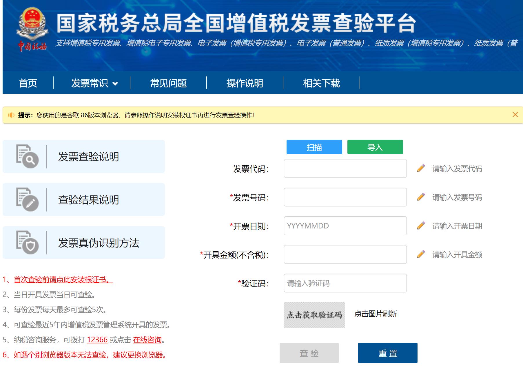 為正常獲取驗證碼查驗發票,需下載和安裝根證書文件,具體操作請參看“操作說明”->“證書安裝”欄目。