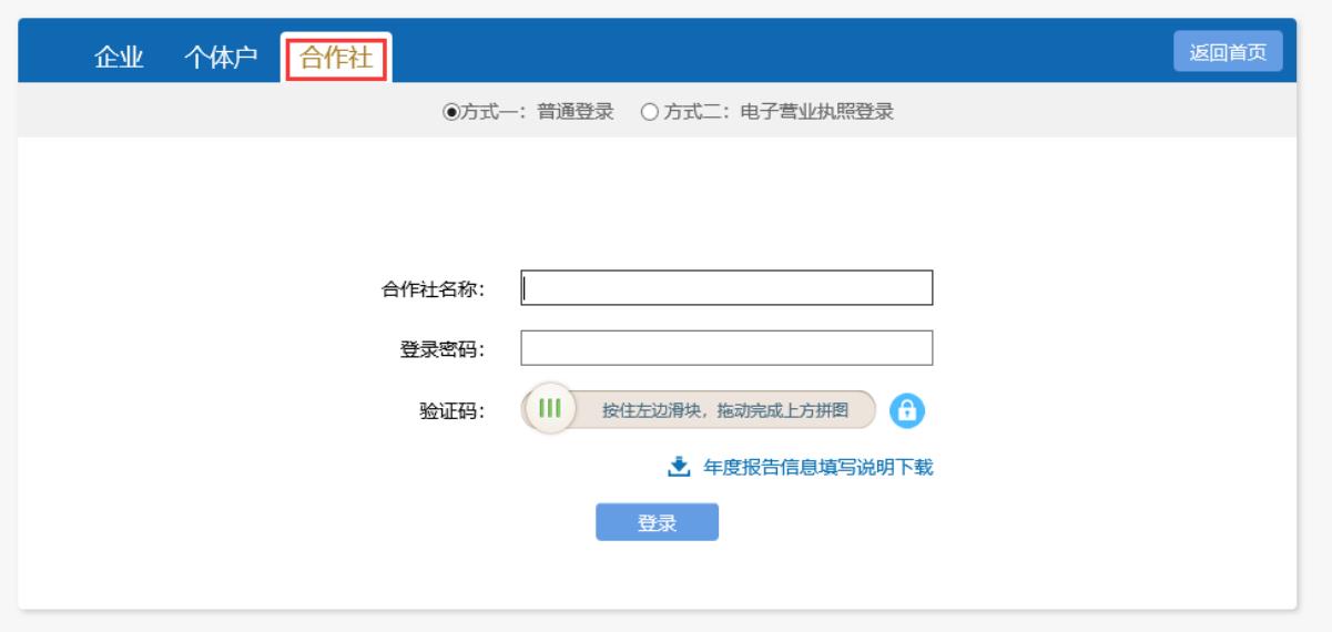 選擇“合作社”標(biāo)簽,填寫合作社名稱及密碼,完成拖動(dòng)驗(yàn)證碼,點(diǎn)擊“登錄”按鈕,完成登錄。