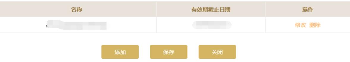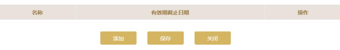 或點(diǎn)擊“添加”按鈕添加許可證信息。點(diǎn)擊頁面下方的“保存”保存本頁信息。