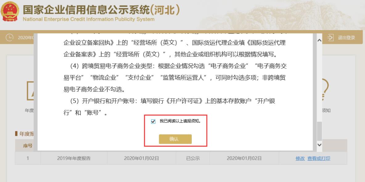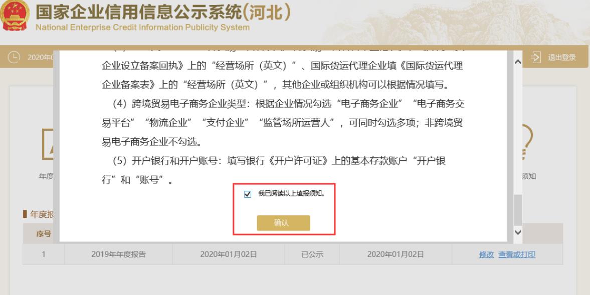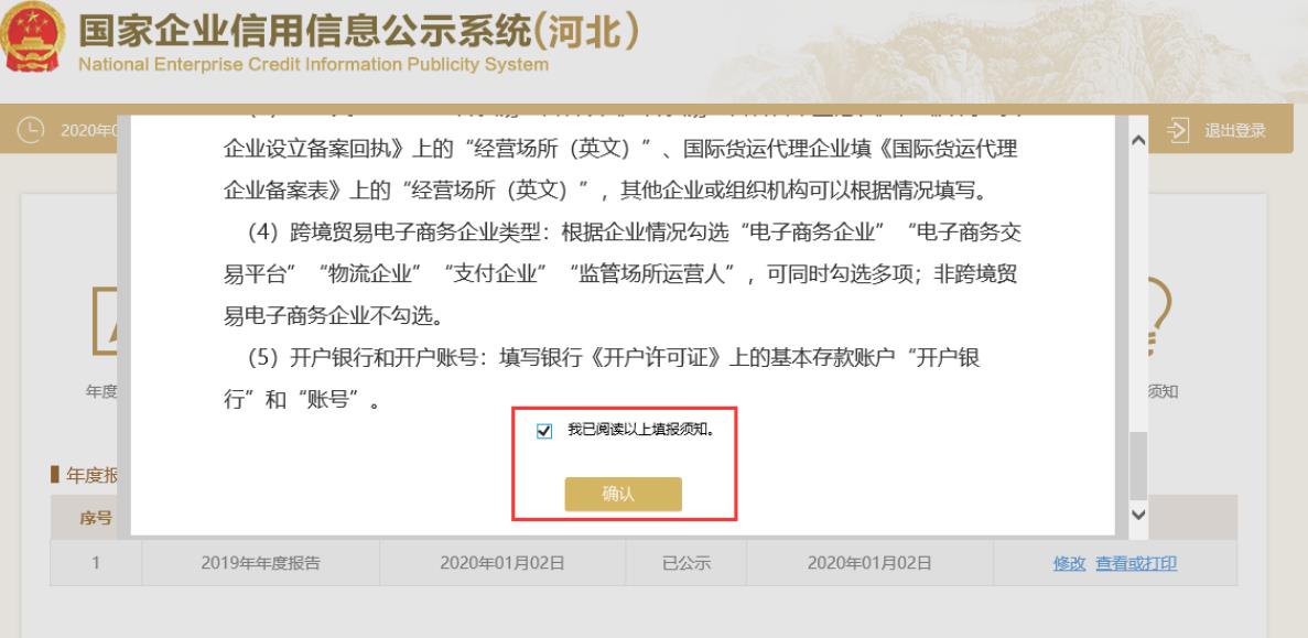 閱讀年報(bào)填報(bào)須知,將填報(bào)須知頁面拖動(dòng)到底部,在“我已閱讀以上填報(bào)須知”前打勾,點(diǎn)擊“確認(rèn)”按鈕。