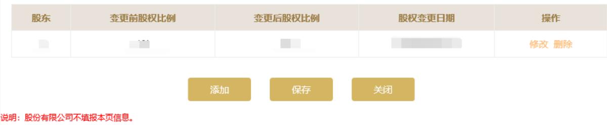 8. 填寫股權(quán)變更信息(如基本信息頁面“是否發(fā)生股東股權(quán)轉(zhuǎn)讓”選擇的“否”則不需要填寫)