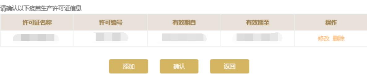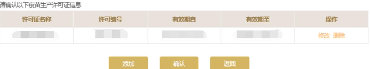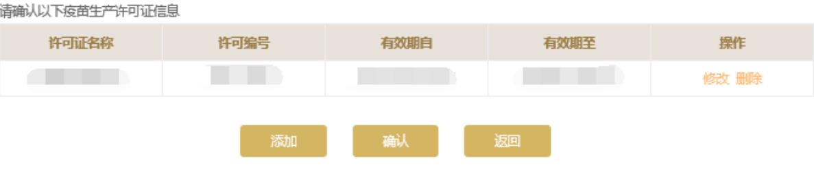 請(qǐng)根據(jù)持有的疫苗許可證信息核實(shí)頁面中的疫苗許可證信息,如需修改點(diǎn)擊“修改”進(jìn)行修改或點(diǎn)擊“添加”按鈕添加許可證信息。點(diǎn)擊頁面下方的“保存”保存本頁信息。