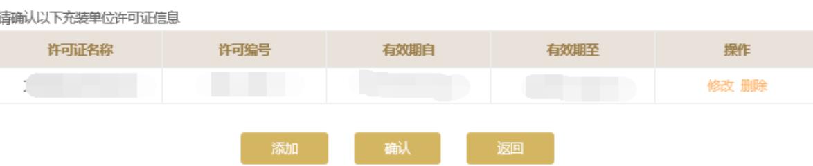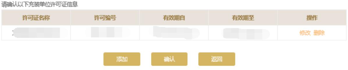 請(qǐng)根據(jù)持有的充裝單位許可證信息核實(shí)頁面中的充裝單位許可證信息,如需修改點(diǎn)擊“修改”進(jìn)行修改或點(diǎn)擊“添加”按鈕添加許可證信息。點(diǎn)擊頁面下方的“保存”保存本頁信息。