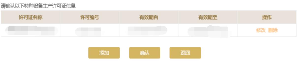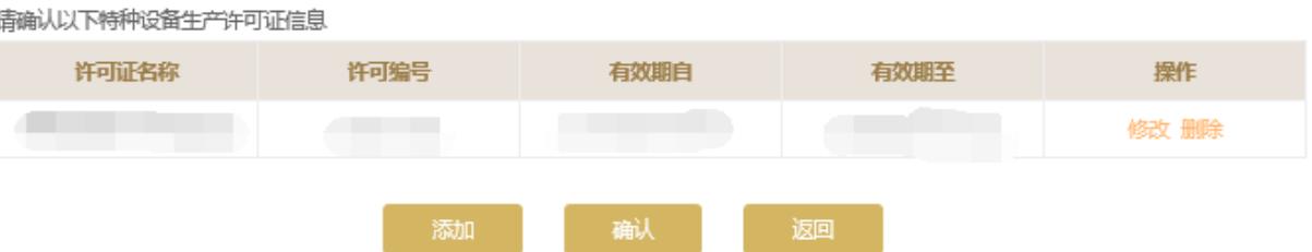 請(qǐng)根據(jù)持有的特種設(shè)備生產(chǎn)許可證信息核實(shí)頁面中的特種設(shè)備生產(chǎn)許可證信息,如需修改點(diǎn)擊“修改”進(jìn)行修改或點(diǎn)擊“添加”按鈕添加許可證信息。點(diǎn)擊頁面下方的“保存”保存本頁信息。