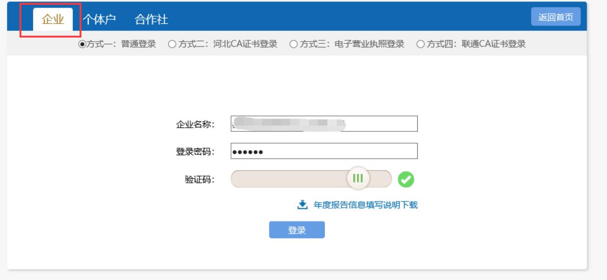選擇“企業(yè)”標(biāo)簽,填寫企業(yè)名稱及密碼,完成拖動(dòng)驗(yàn)證碼,點(diǎn)擊“登錄”按鈕,完成登錄。