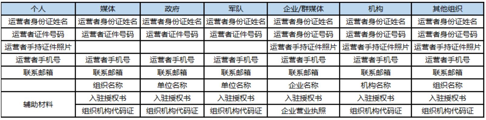 2.2 凡入駐帳號,應(yīng)保證帳號信息與上傳的材料具有關(guān)聯(lián)性。帳號信息包括帳號類型、帳號名稱、帳號描述、帳號頭像、帳號領(lǐng)域,上傳的材料包括經(jīng)營人信息、輔助材料、組織機(jī)構(gòu)代碼證和營業(yè)執(zhí)照。
