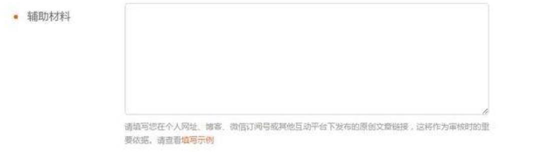 輔助材料體現(xiàn)用戶運(yùn)營自媒體的能力,是入駐申請審核時的重要依據(jù)。您需按照“填寫示例”填寫輔助材料。
