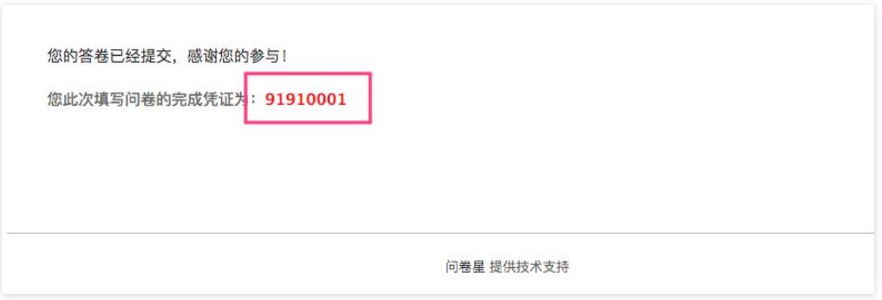 完成憑證是提供給填寫者用來證明他已經(jīng)填寫完成問卷的一串代碼,例如“10310010”,由問卷星系統(tǒng)自動生成。