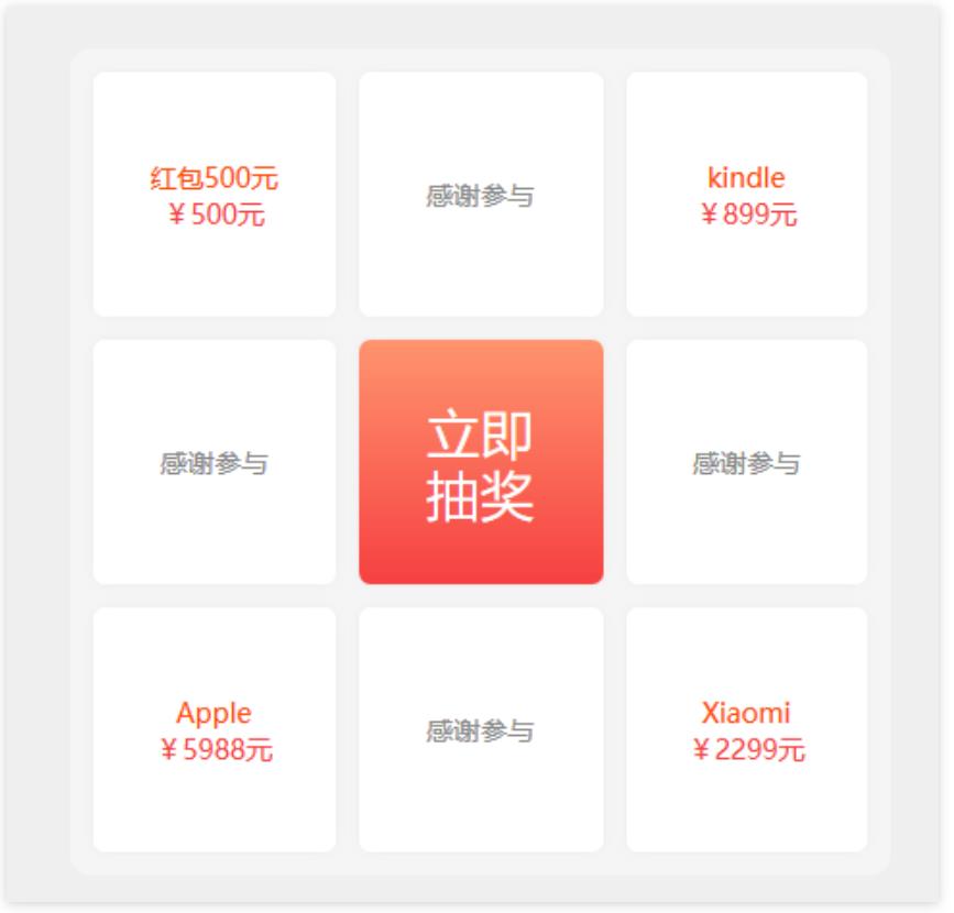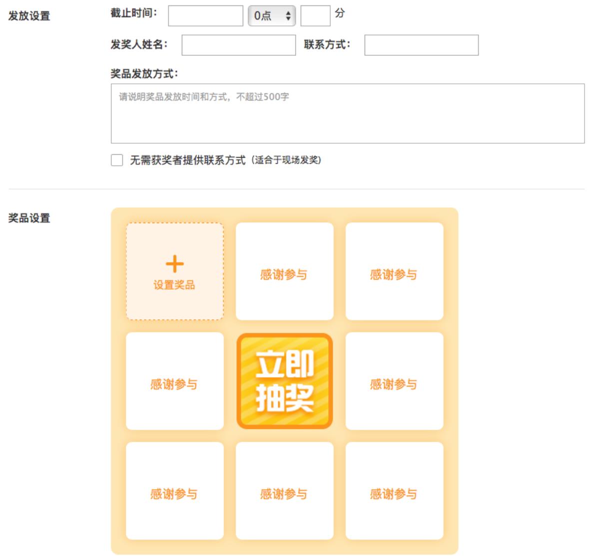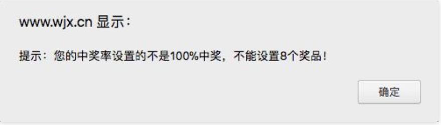 抽獎的九宮格中,可以設(shè)置獎品的有八個。在增加第八個獎品時,系統(tǒng)會有如下的提示!必須設(shè)置100%中獎才可以增加第八個獎品。另,如果所有獎品都已經(jīng)發(fā)放完,頁面上會提示獎品已領(lǐng)取完,不能再點擊抽獎。