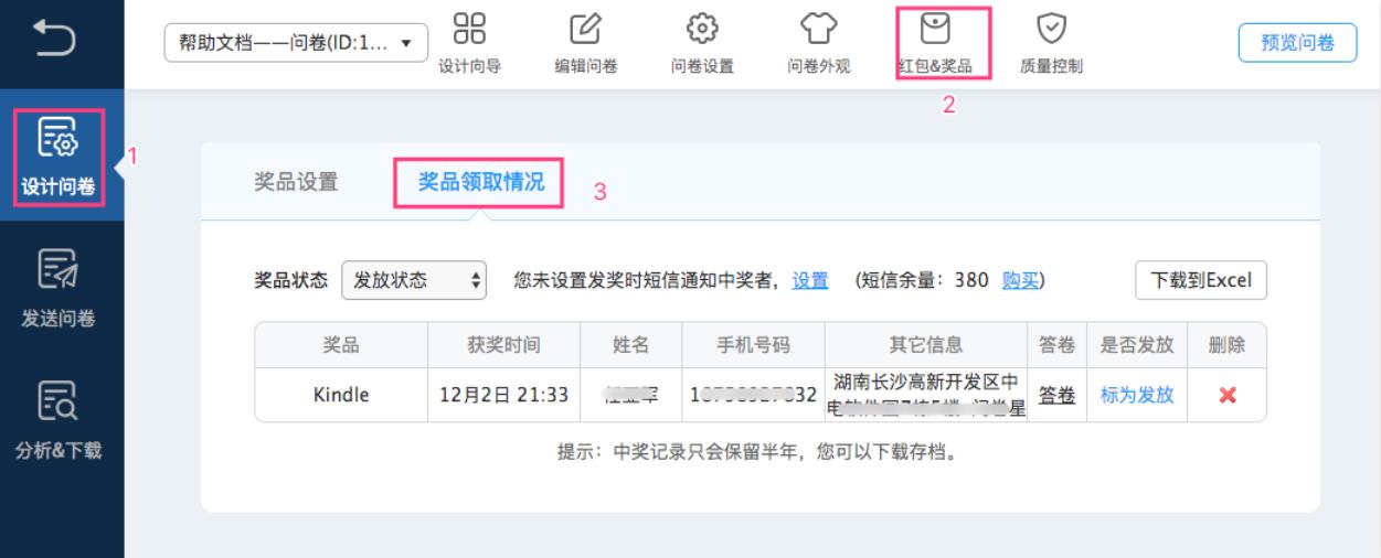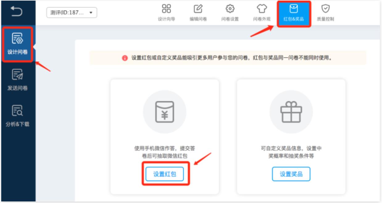 一、問卷星設(shè)置入口:點擊設(shè)計問卷,在標簽欄中選擇紅包&獎品,再選擇設(shè)置獎品