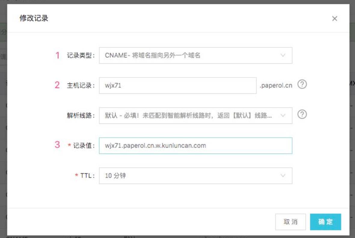 5、為上一步的域名設(shè)置CNAME記錄值(在綁定域名頁面,輸入域名就可以獲取專屬的CNAME記錄值),如第二步中的域名對應的CNAME就是:wjx71.paperol.cn.w.kunluncan.com 。操作如下圖所示: