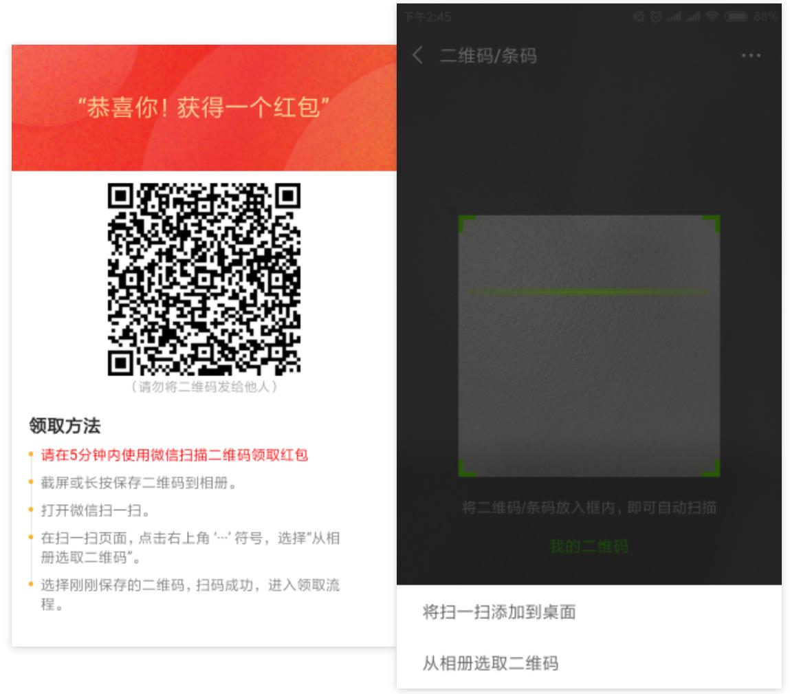 3、將紅包二維碼截圖保存,進入微信“掃一掃”,點擊右上角“···”,從相冊選取二維碼。