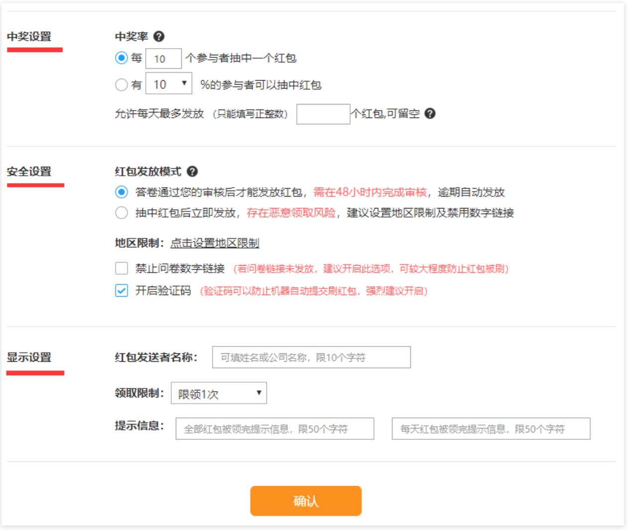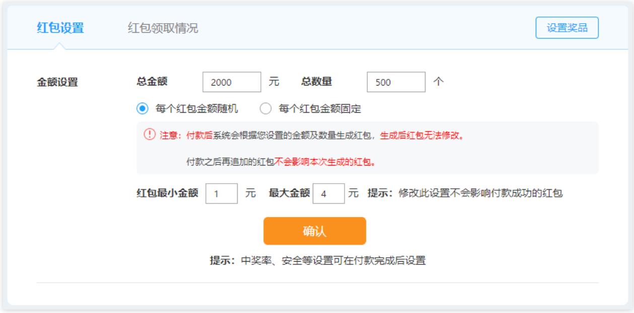3、完成支付后,會進入紅包功能詳細設(shè)置頁面,可以設(shè)置中獎概率,安全設(shè)置以及領(lǐng)取時顯示的信息。