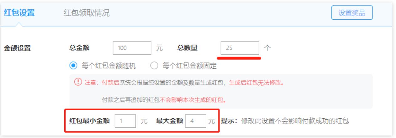 4.若您想控制隨機金額的上,下限可以點擊更多設(shè)置。注意:在設(shè)置紅包個數(shù)要大于總金額÷最大金額。以下圖為例,設(shè)置的紅包個數(shù)要大于圖中的25個。