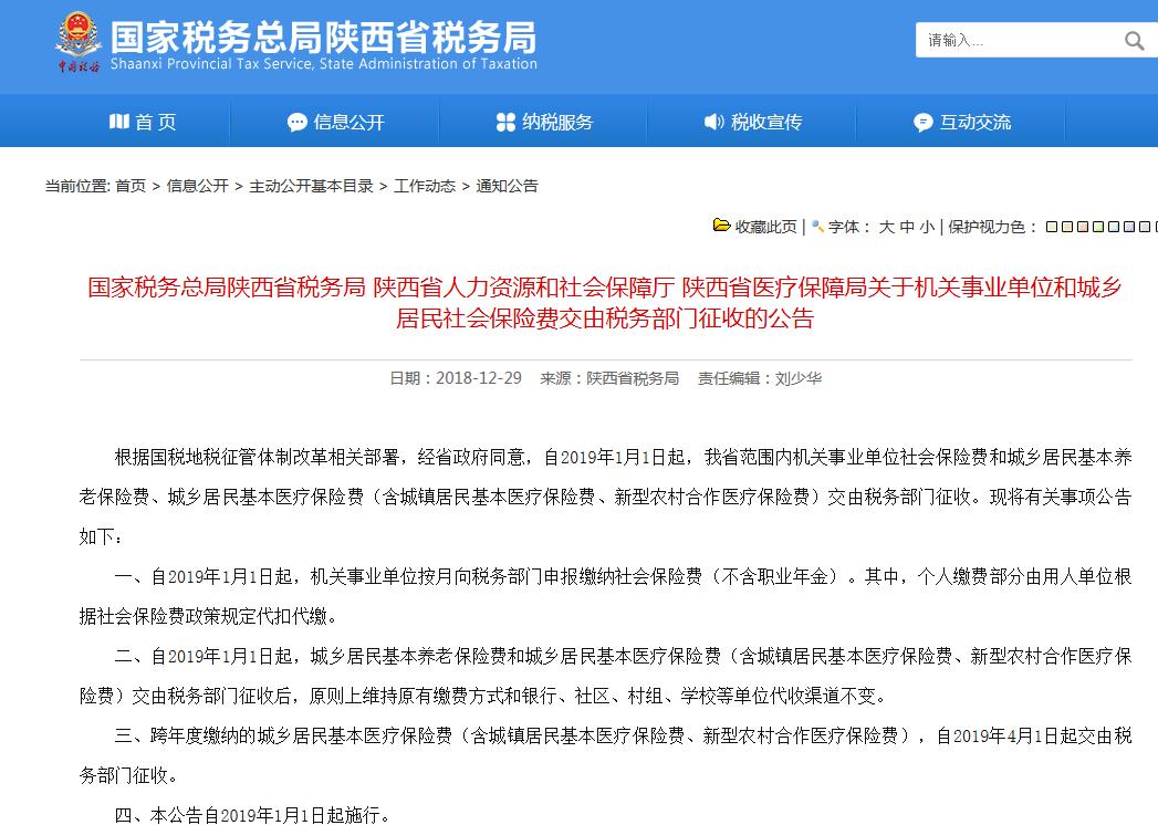 根據(jù)國稅地稅征管體制改革相關(guān)部署,經(jīng)省政府同意,自2019年1月1日起,我省范圍內(nèi)機(jī)關(guān)事業(yè)單位社會保險(xiǎn)費(fèi)和城鄉(xiāng)居民基本養(yǎng)老保險(xiǎn)費(fèi)、城鄉(xiāng)居民基本醫(yī)療保險(xiǎn)費(fèi)(含城鎮(zhèn)居民基本醫(yī)療保險(xiǎn)費(fèi)、新型農(nóng)村合作醫(yī)療保險(xiǎn)費(fèi))交由稅務(wù)部門征收。現(xiàn)將有關(guān)事項(xiàng)公告如下: