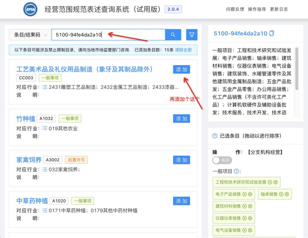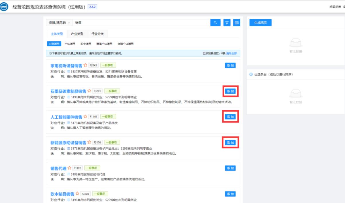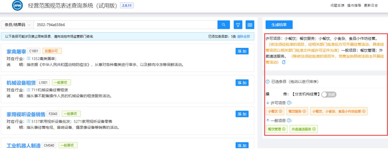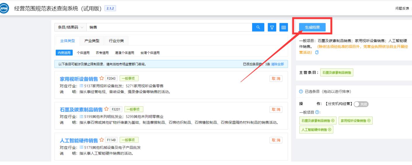 隨后可以繼續(xù)進(jìn)行條目的搜索添加、刪減或直接點(diǎn)擊《生成結(jié)果》按鈕完成經(jīng)營(yíng)范圍的選擇。