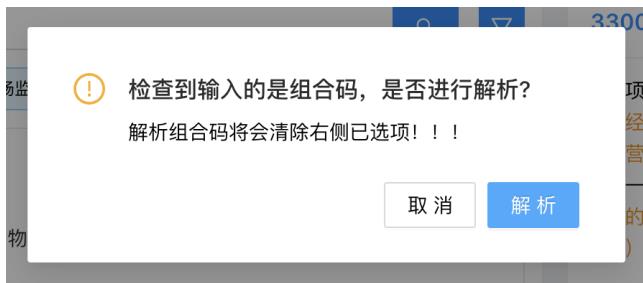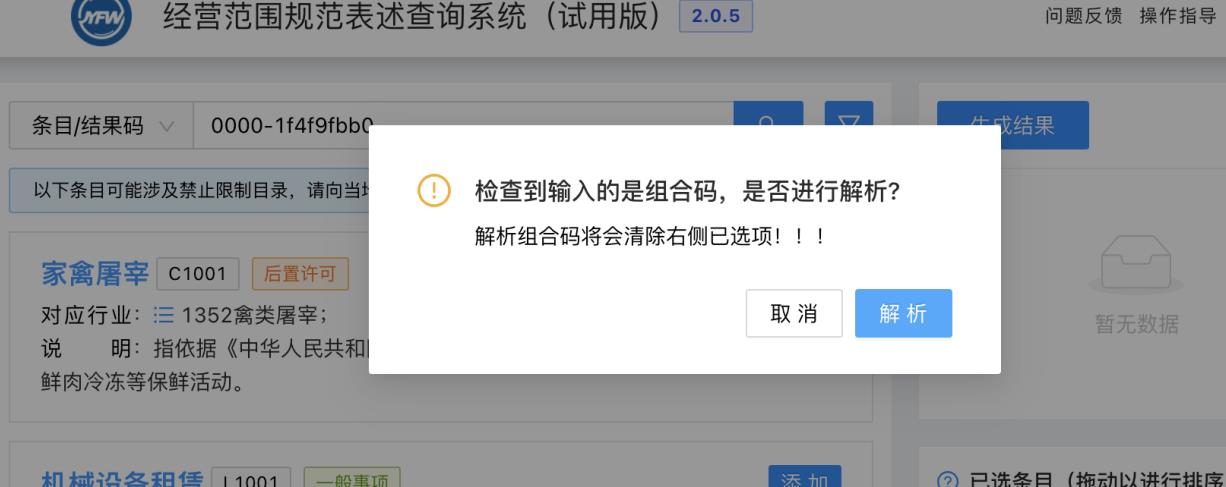 點(diǎn)擊解析后,組合碼中的所存儲(chǔ)的經(jīng)營(yíng)范圍就會(huì)再右側(cè)已選擇條目中出現(xiàn):