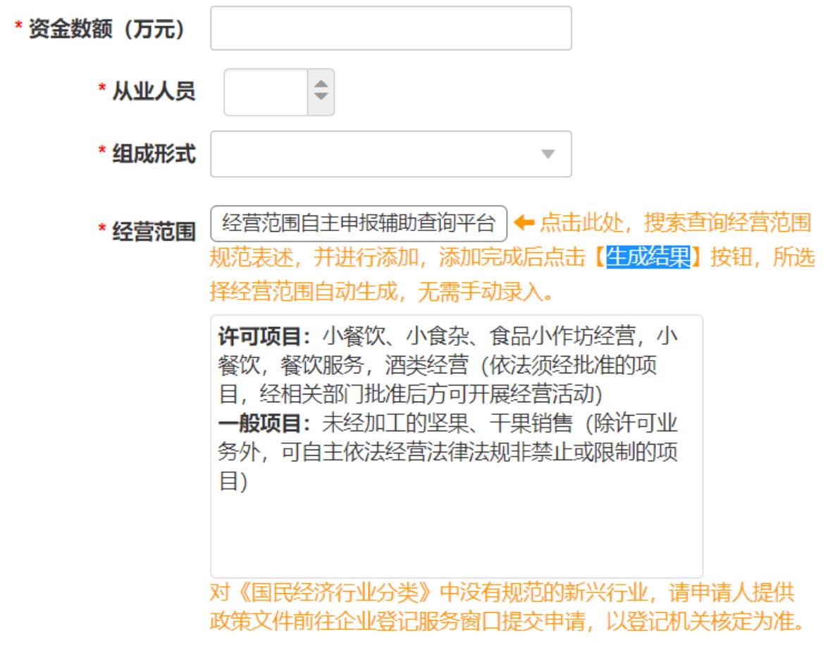 隨后可以繼續(xù)進(jìn)行條目的搜索添加或直接點(diǎn)擊《生成結(jié)果》按鈕完成經(jīng)營(yíng)范圍的選擇。