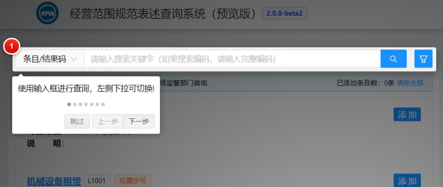 關(guān)鍵詞查詢是您在使用本系統(tǒng)最常使用的功能,我們通過智能分詞的方式,對(duì)您所輸入的內(nèi)容進(jìn)行解析然后去經(jīng)營(yíng)范圍標(biāo)準(zhǔn)條目庫中進(jìn)行檢索。