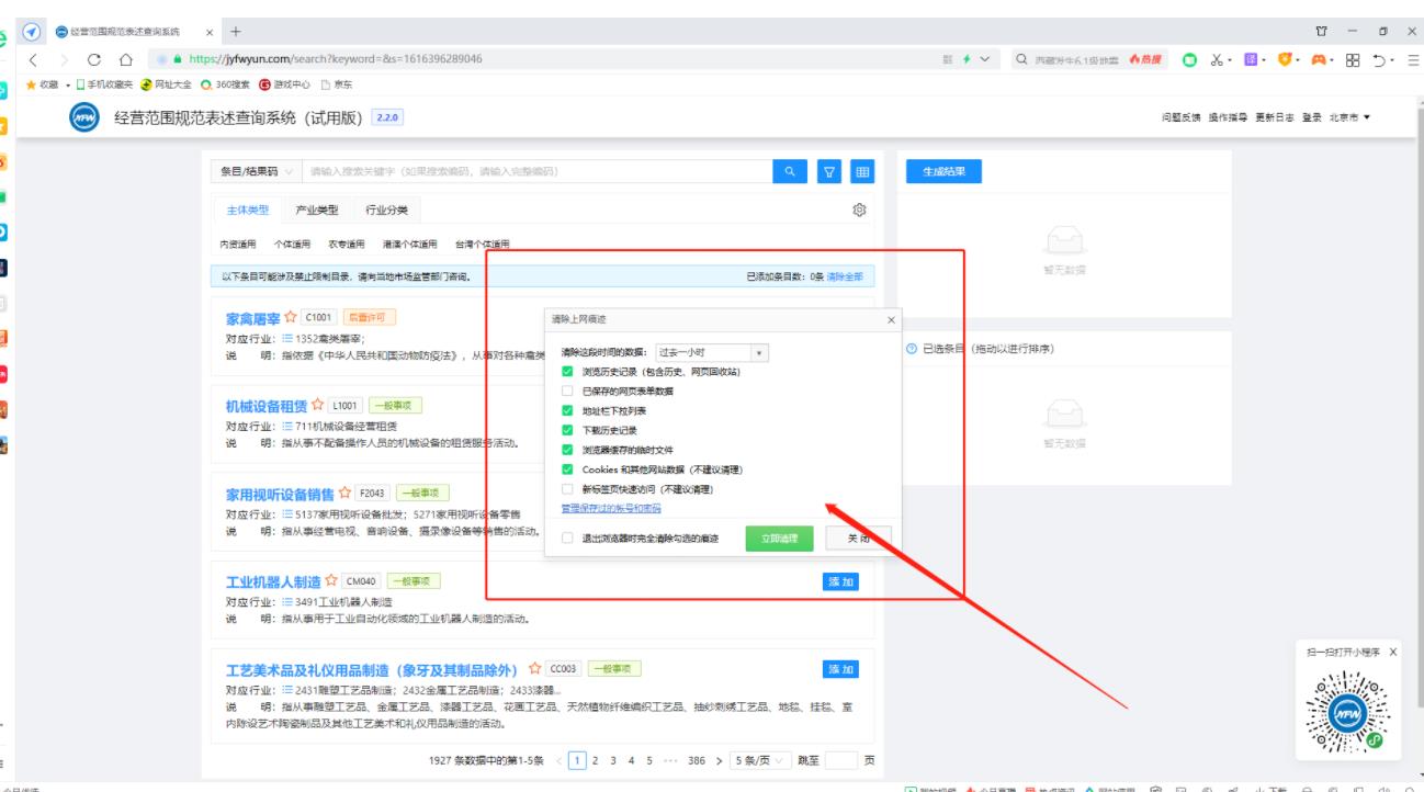 點(diǎn)擊添加經(jīng)營(yíng)范圍規(guī)范表述按鈕,打開經(jīng)營(yíng)范圍選擇彈窗。
