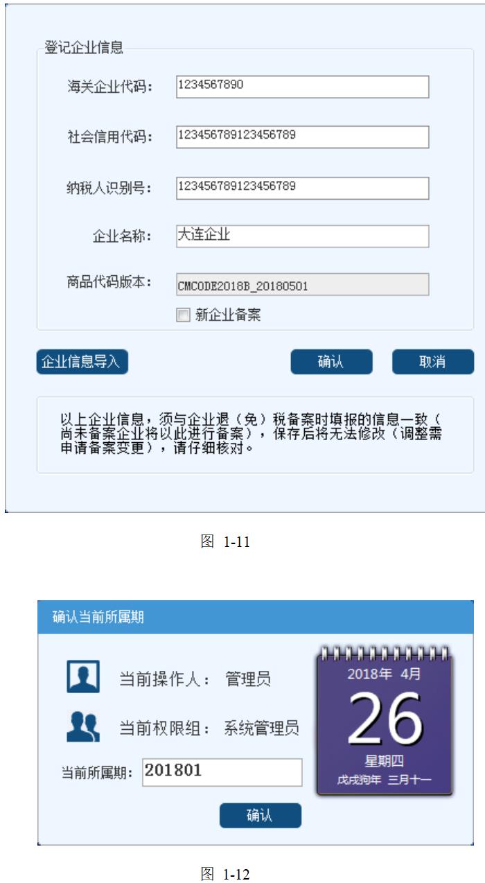登錄后即可進入“登記企業信息”界面,在此界面配置“企業海關代碼”、“社會信用代碼”、 “納稅人識別號”和“企業名稱”的信息,或者通過“企業信息導入”按鈕,選擇備份數據來導入企業信息。然后點擊“確定”按鈕即可進入系統。登錄所屬期應與納稅所屬期一致,格式:年+月(例:201801)。如圖: