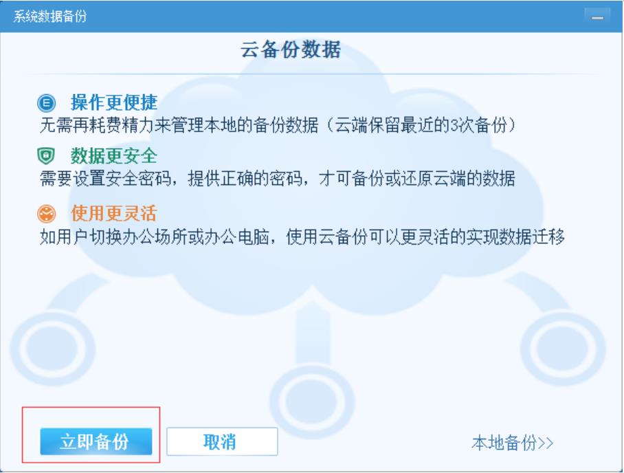 點擊“系統維護”菜單,選擇 “系統數據備份”項,系統彈出對話框后,選擇“立即備份”按鈕,進行系統備份數據,如圖: