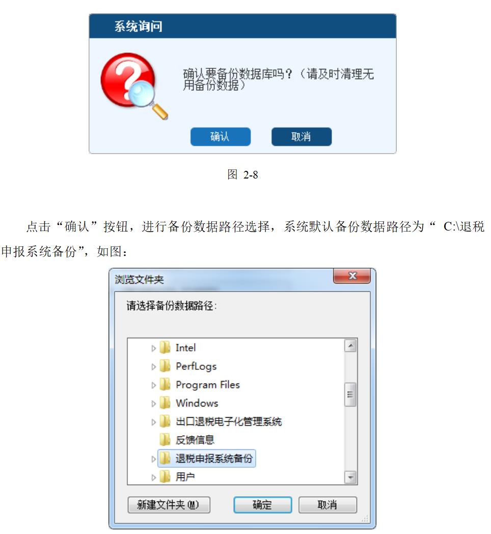 點擊“確認”按鈕,進行備份數據路徑選擇,系統默認備份數據路徑為“ C:\退稅申報系統備份”,如圖: