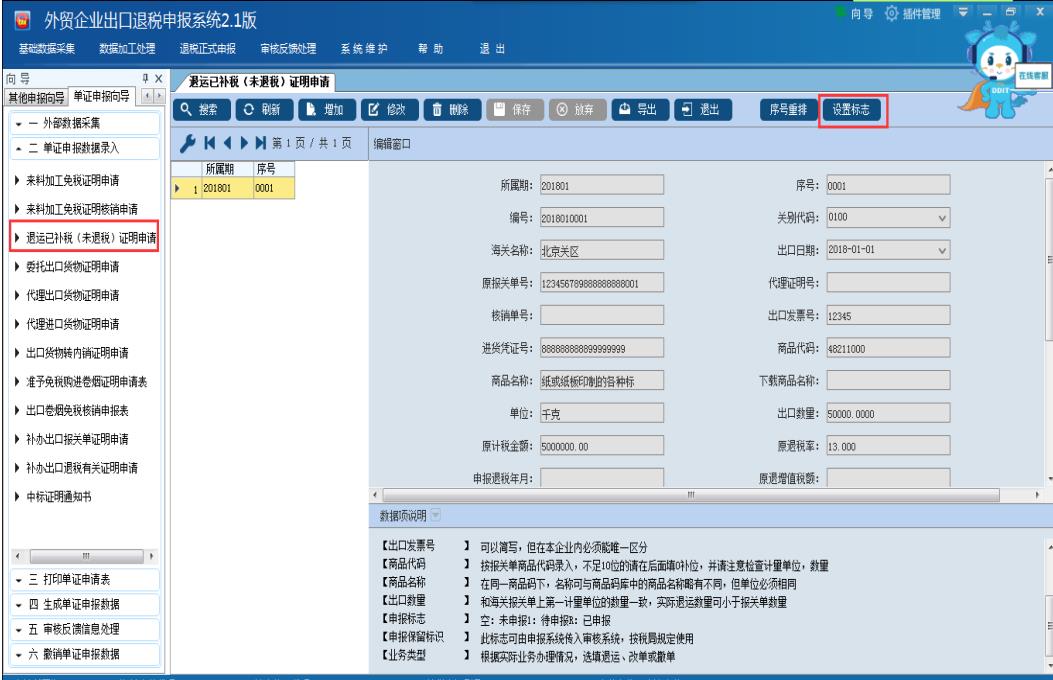 選擇申報系統“單證申報向導”第二步“單證申報數據錄入”,根據自身業務選擇對應表單進行錄入,數據保存后,進行設置標志的操作,如圖: