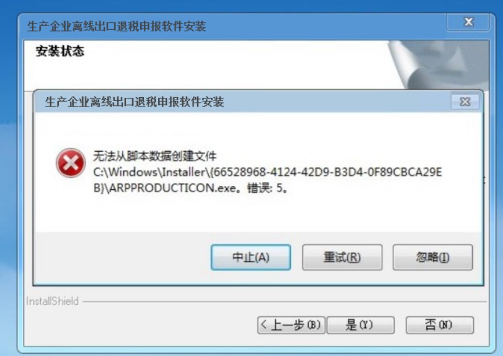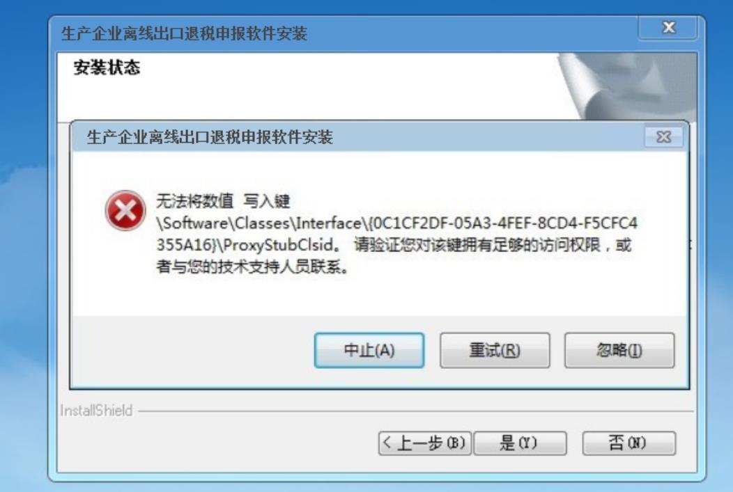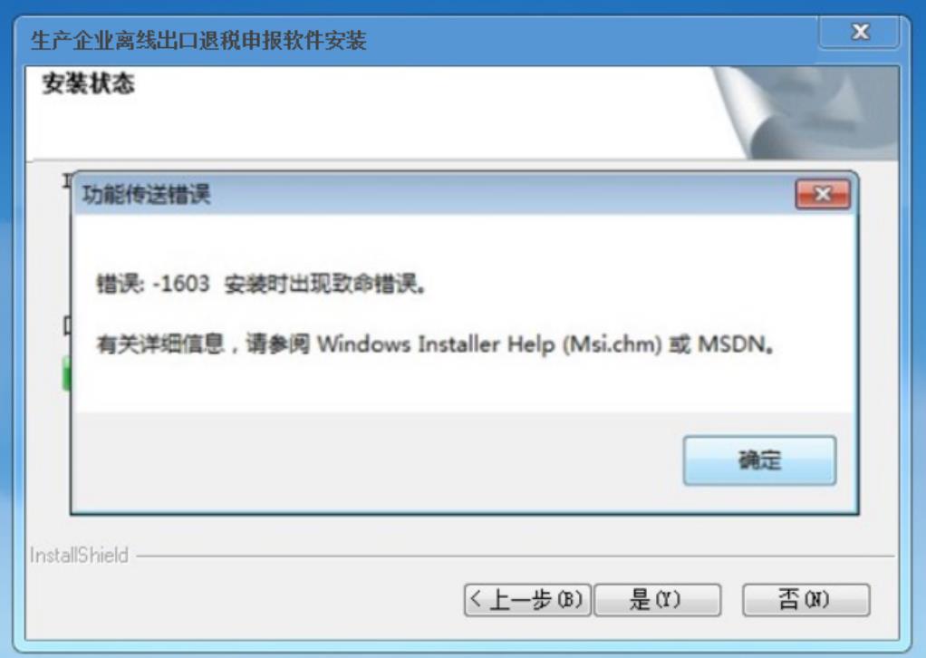 3. 在安裝出口退稅申報(bào)軟件時(shí),建議關(guān)閉安全衛(wèi)士、殺毒軟件、防火墻等相關(guān)安全防護(hù)軟件,因?yàn)榘踩雷o(hù)軟件等級(jí)過(guò)高會(huì)影響申報(bào)系統(tǒng)安裝,或?qū)е掳惭b不成功;特別是錯(cuò)誤提示為如下情況時(shí),請(qǐng)嘗試關(guān)閉相關(guān)安全防護(hù)軟件后,再進(jìn)行安裝: