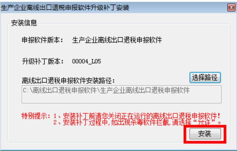 2.雙擊運(yùn)行程序,補(bǔ)丁包將自動(dòng)檢測(cè)已安裝的出口退稅申報(bào)系統(tǒng)的安裝路徑,如路徑不正確可點(diǎn)擊“選擇路徑”更改路徑,企業(yè)用戶在核對(duì)安裝路徑無(wú)誤后,單擊“安裝”開(kāi)始升級(jí):