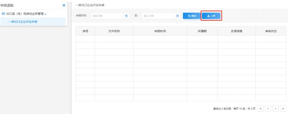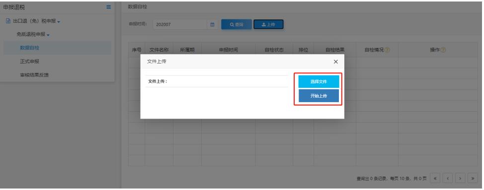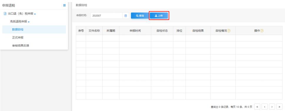 在出口退(免)稅申報的數(shù)據(jù)自檢模塊中點擊“上傳”按鈕,進(jìn)行數(shù)據(jù)自檢上傳操作。如圖: