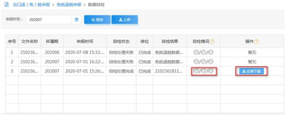 自檢完成后可點擊“自檢情況”里的數(shù)字按鈕可直接查看自檢的疑點詳情,也可點擊“反饋下載”按鈕,下載自檢數(shù)據(jù)反饋文件,將反饋的文件讀入到離線版出口退稅申報系統(tǒng)中查看疑點詳情。如圖:
