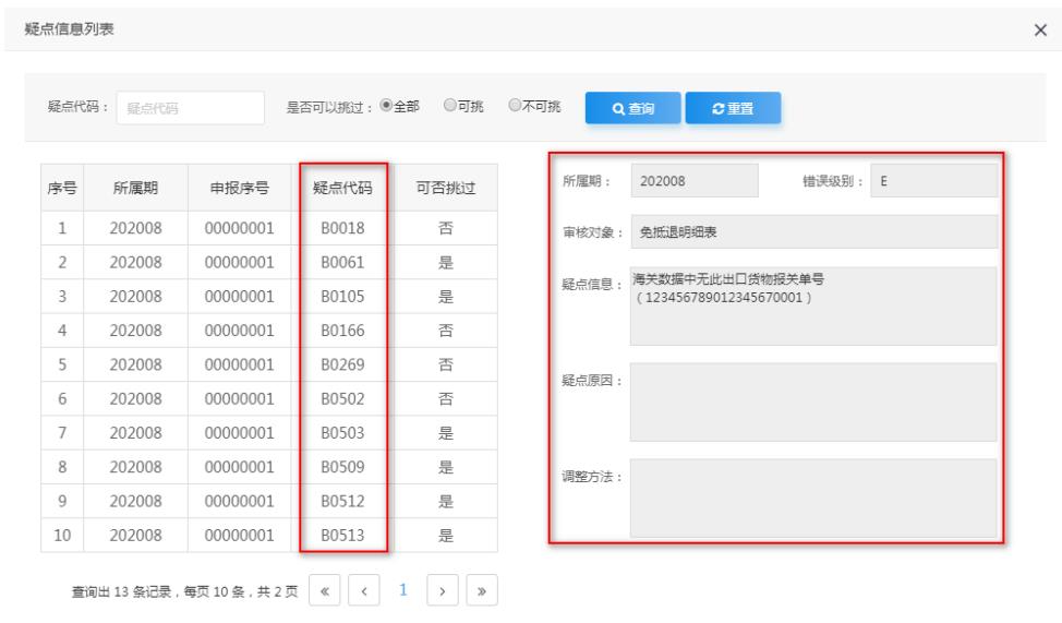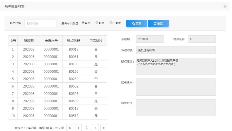 點擊“自檢情況”下的數(shù)字,可彈出疑點信息列表,能夠查看具體的疑點內(nèi)容。如圖: