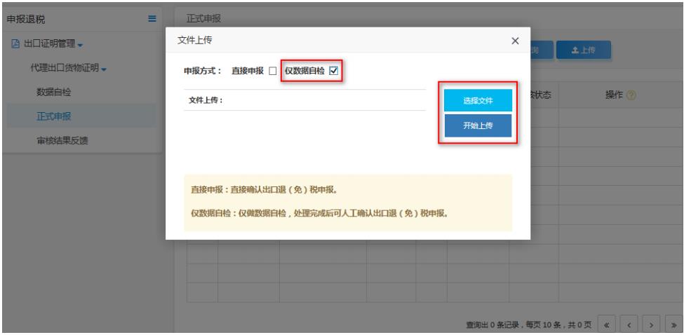企業(yè)通過正式申報頁面,點擊“上傳”按鈕,選擇“僅數(shù)據(jù)自檢”,點擊“選擇文件”選擇要上傳的申報數(shù)據(jù)文件,并點擊“開始上傳”上傳申報數(shù)據(jù)。如圖: