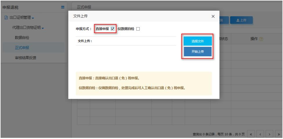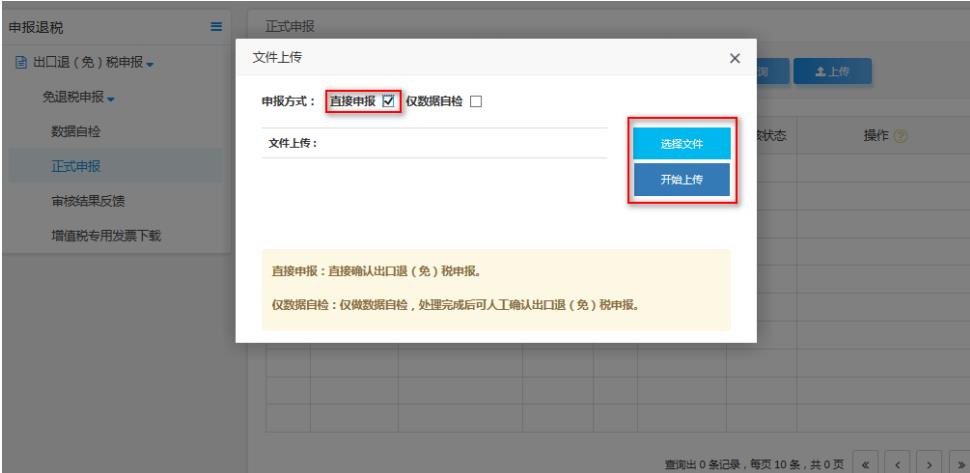 企業(yè)通過免退申報正式申報頁面,點擊“上傳”按鈕,選擇“直接申報”,點擊“選擇文件”選擇要上傳的申報數(shù)據(jù)文件,并點擊“開始上傳”上傳申報數(shù)據(jù)。如圖:
