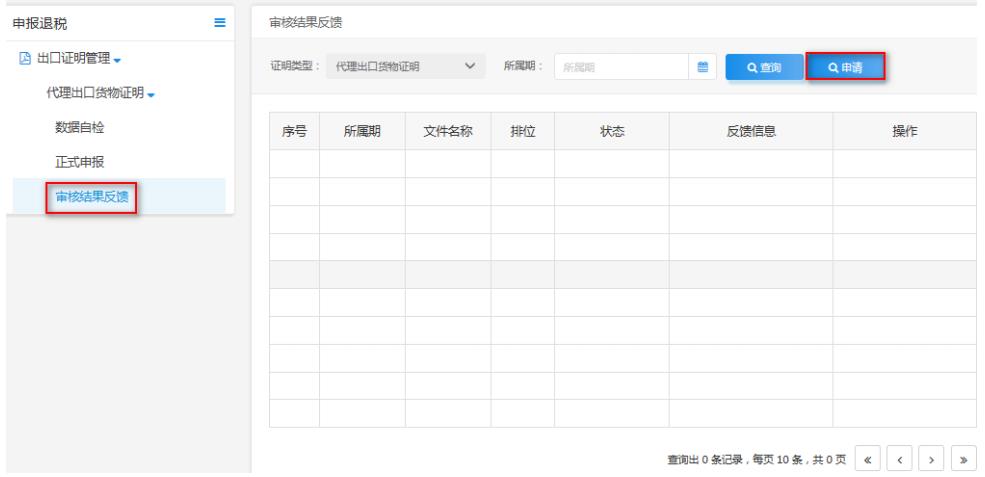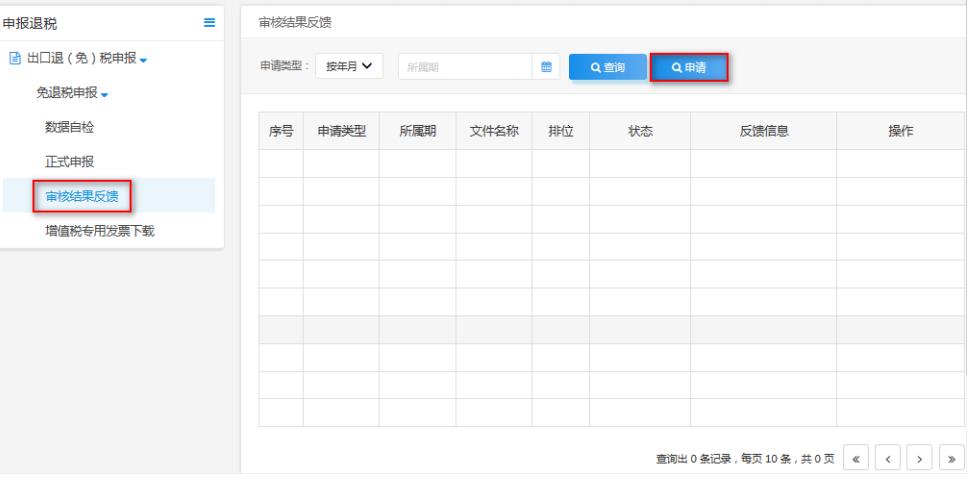 選擇“申請類型”,輸入“申報年月”,點擊“申請”按鈕進(jìn)行審核結(jié)果反饋。待反饋數(shù)據(jù)組裝、加密后,通過點擊“下載”按鈕下載審核結(jié)果數(shù)據(jù)。如圖: