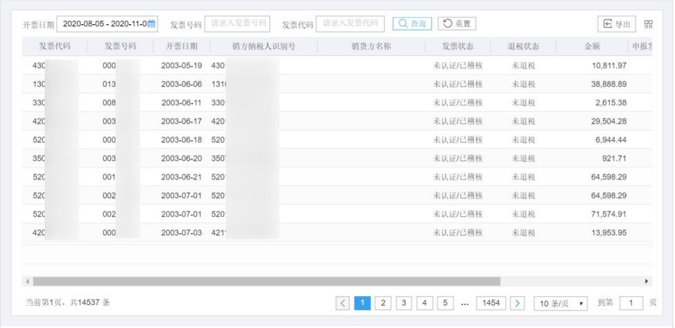 輸入“發(fā)票代碼”、“發(fā)票號碼”或者輸入“開票日期”時間區(qū)間,點擊“查詢”按鈕,可查詢相關(guān)發(fā)票信息。