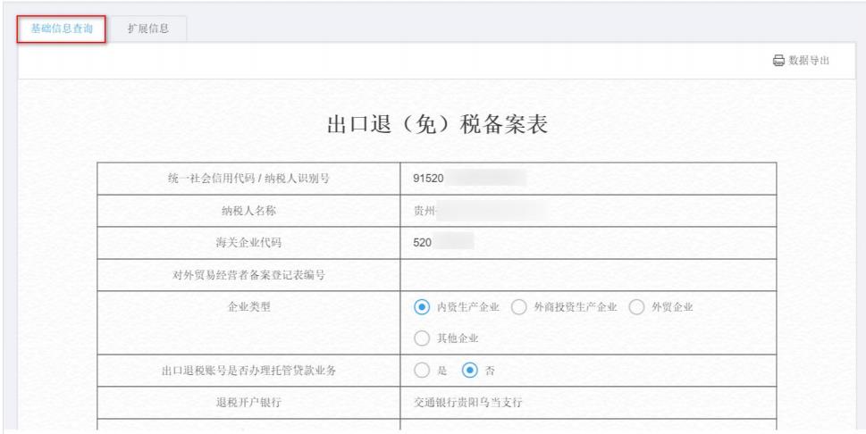點擊“出口退稅信息查詢”菜單中的“企業(yè)備案信息查詢”可以實現(xiàn)查詢出口退(免)稅備案的基礎(chǔ)信息和擴(kuò)展信息。如圖:
