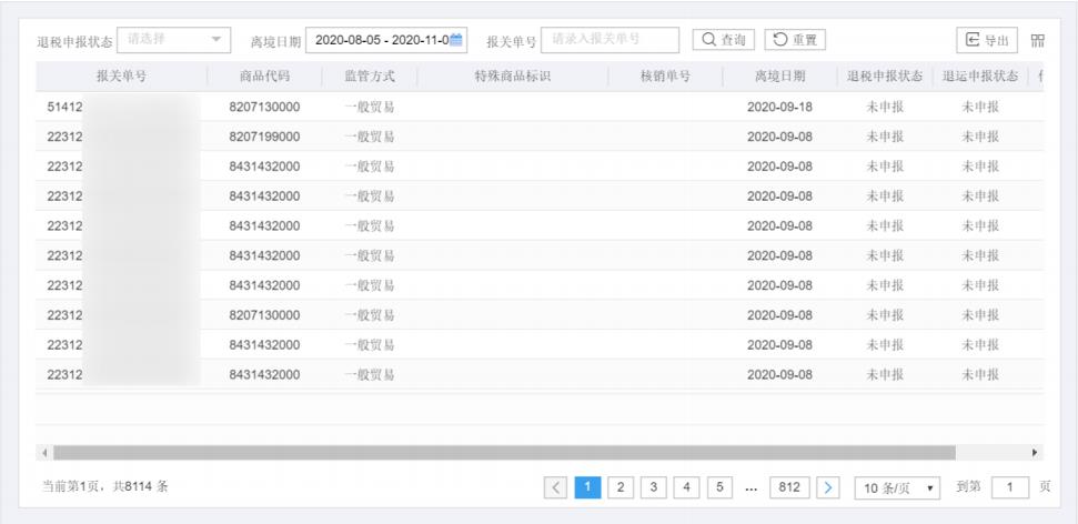 輸入“報關(guān)單號”或者輸入“離境日期”時間區(qū)間或者選擇“退稅申報狀態(tài)”,點擊“查詢”按鈕,可查詢相關(guān)報關(guān)單信息。