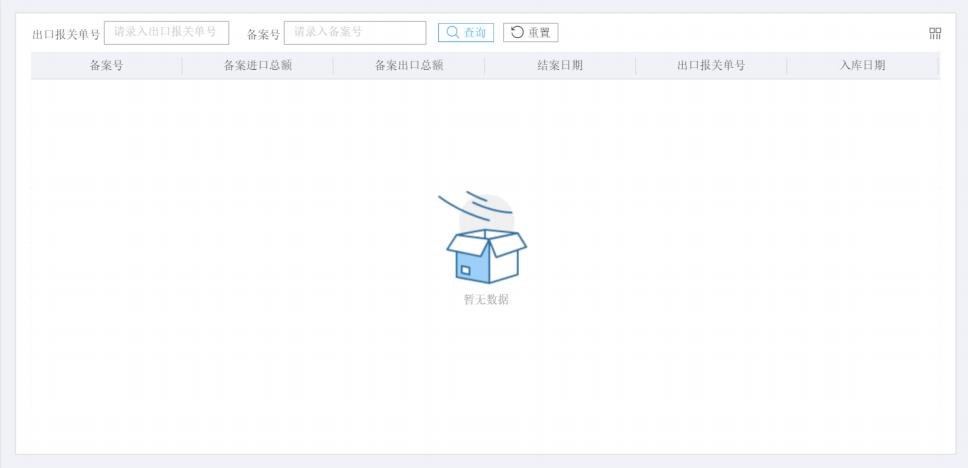 輸入“出口報關(guān)單號”或者“備案號”等查詢條件,點擊“查詢”按鈕,可查詢相關(guān)電子賬冊信息。