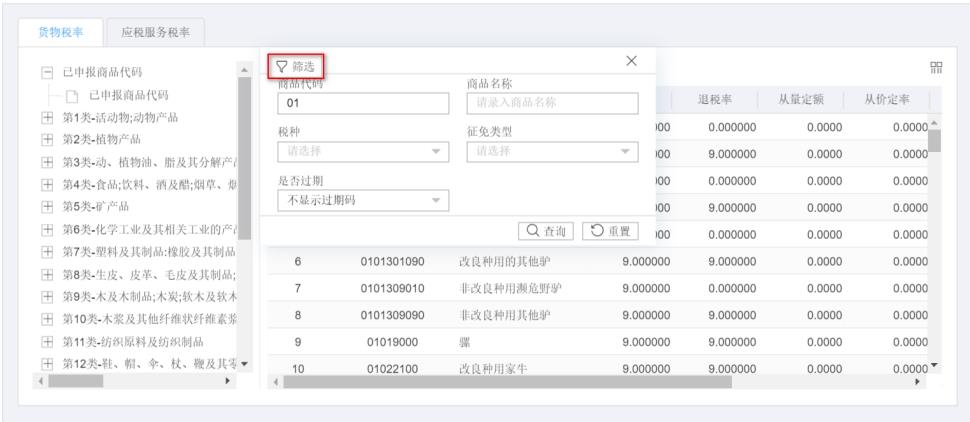 點擊“貨物稅率”中的“篩選”按鈕,輸入“商品代碼”或者輸入“商品名稱”或 者“稅種”、“征免類型”、“是否過期”等條件,點擊“查詢”按鈕,可查詢相關(guān)出口商品退稅率信息。如圖: