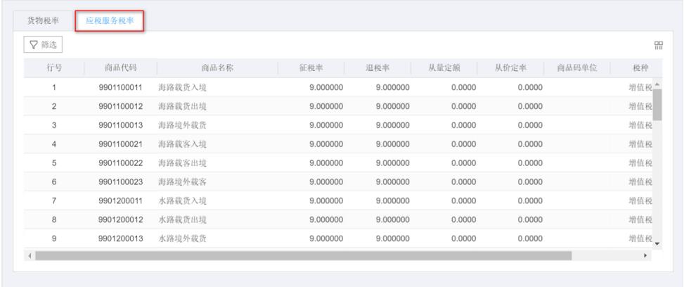 點擊“篩選”按鈕,輸入查詢條件,可查詢相關(guān)應(yīng)稅服務(wù)稅率信息。