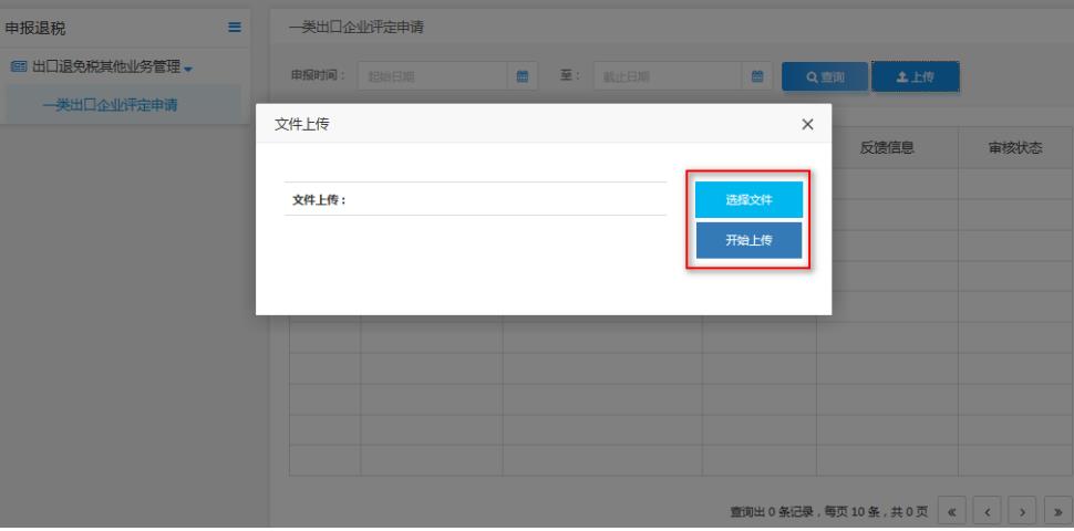 點擊每個模塊后方的離線申報,進(jìn)入對應(yīng)業(yè)務(wù)模塊操作頁面。(以一類出口企業(yè)評定申請為例)點擊“上傳”按鈕,點擊“選擇文件”選擇要上傳的申報數(shù)據(jù)文件,并點擊“開始上傳”上傳申報數(shù)據(jù)。如圖: