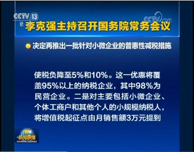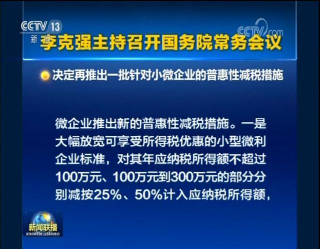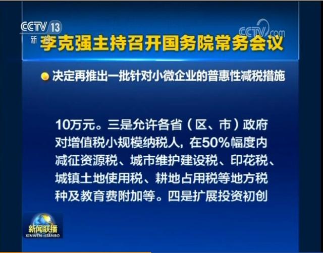 會議指出,貫徹中央經濟工作會議精神,保持今年經濟運行在合理區間,努力實現一季度平穩開局十分重要。必須多管齊下。發展好小微企業關系經濟平穩運行和就業穩定。會議決定,對小微企業推出一批新的普惠性減稅措施。一是大幅放寬可享受企業所得稅優惠的小型微利企業標準,同時加大所得稅優惠力度,對小型微利企業年應納稅所得額不超過100萬元、100萬元到300萬元的部分,分別減按25%、50%計入應納稅所得額,使稅負降至5%和10%。調整后優惠政策將覆蓋95%以上的納稅企業,其中98%為民營企業。二是對主要包括小微企業、個體工商戶和其他個人的小規模納稅人,將增值稅起征點由月銷售額3萬元提高到10萬元。三是允許各省(區、市)政府對增值稅小規模納稅人,在50%幅度內減征資源稅、城市維護建設稅、印花稅、城鎮土地使用稅、耕地占用稅等地方稅種及教育費附加、地方教育附加。四是擴展投資初創科技型企業享受優惠政策的范圍,使投向這類企業的創投企業和天使投資個人有更多稅收優惠。五是為彌補因大規模減稅降費形成的地方財力缺口,中央財政將加大對地方一般性轉移支付。上述減稅政策可追溯至今年1月1日,實施期限暫定三年,預計每年可再為小微企業減負約2000億元。