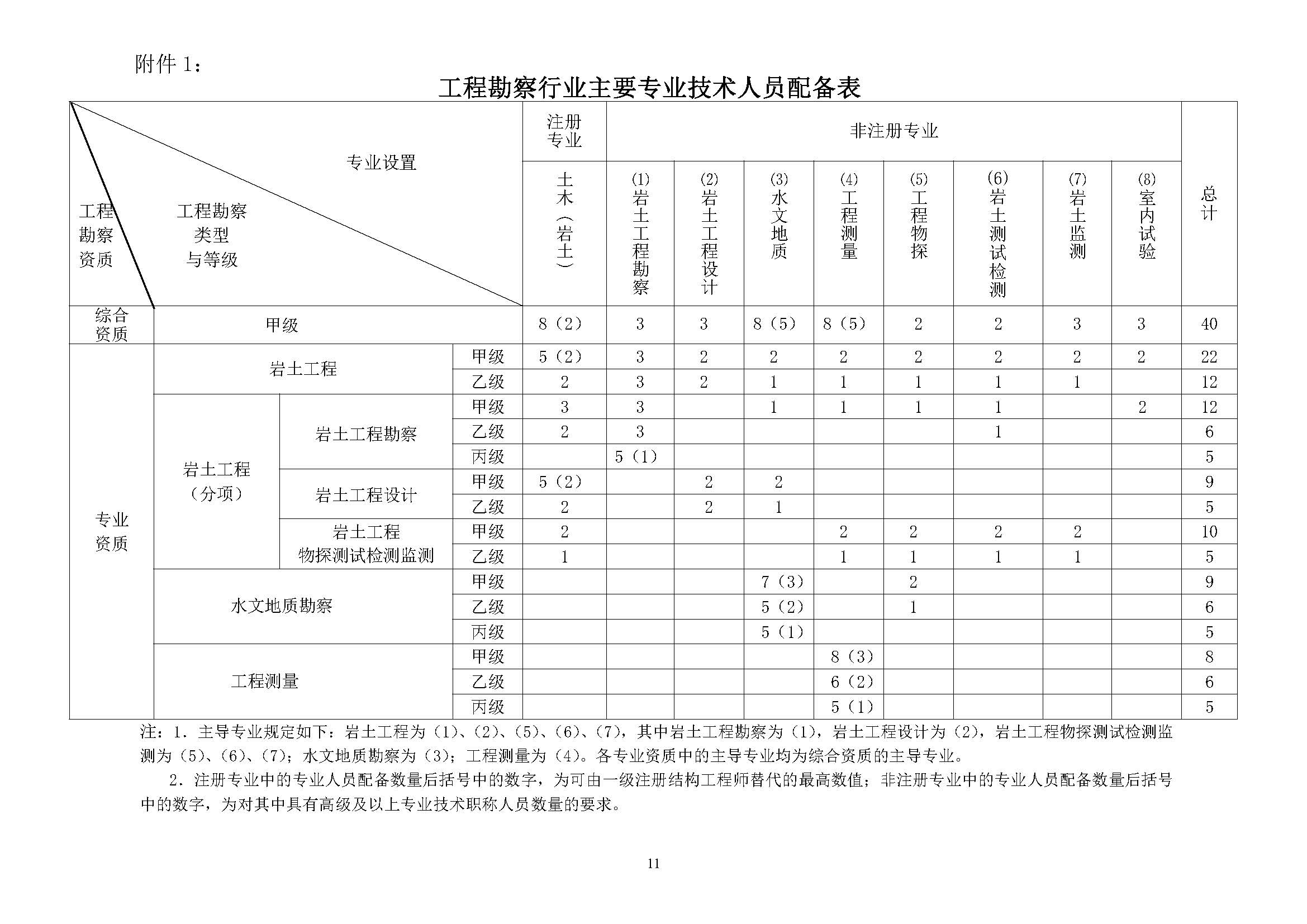 (1)專業配備齊全、合理。主要專業技術人員數量不少于 “工程勘察行業主要專業技術人員配備表”規定的人數。