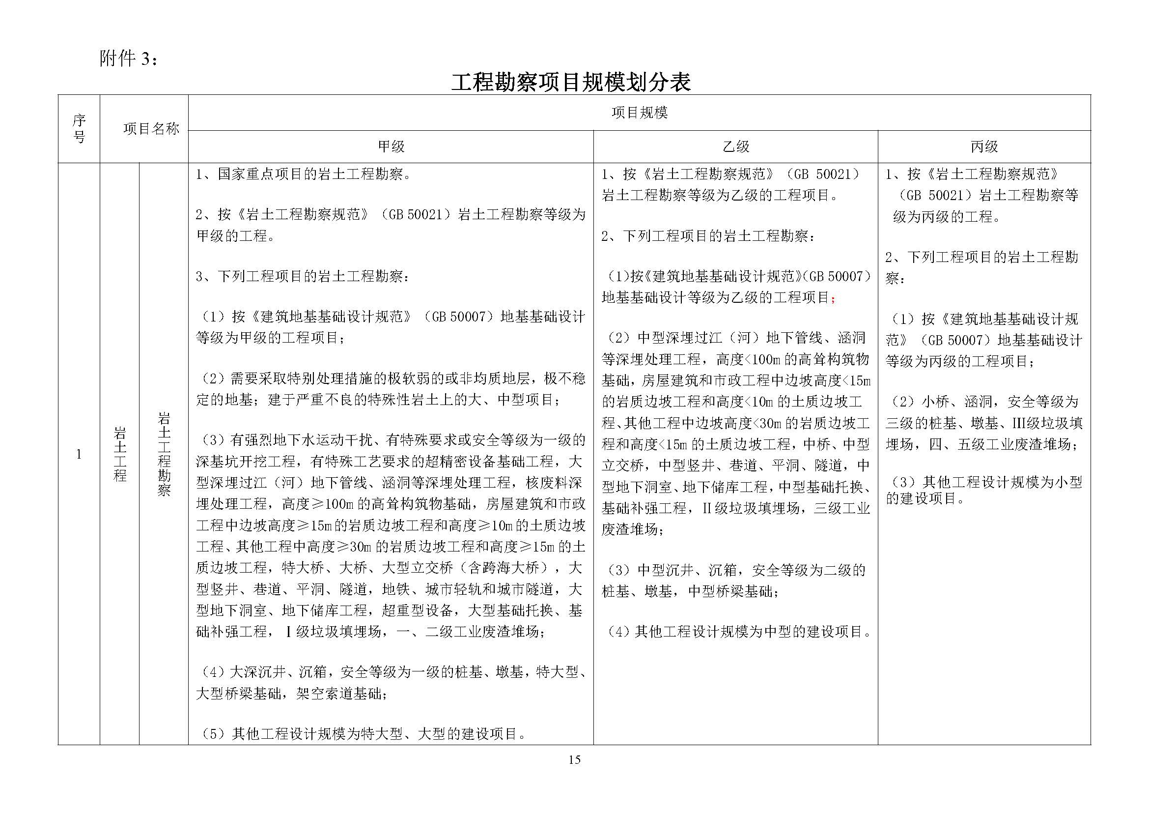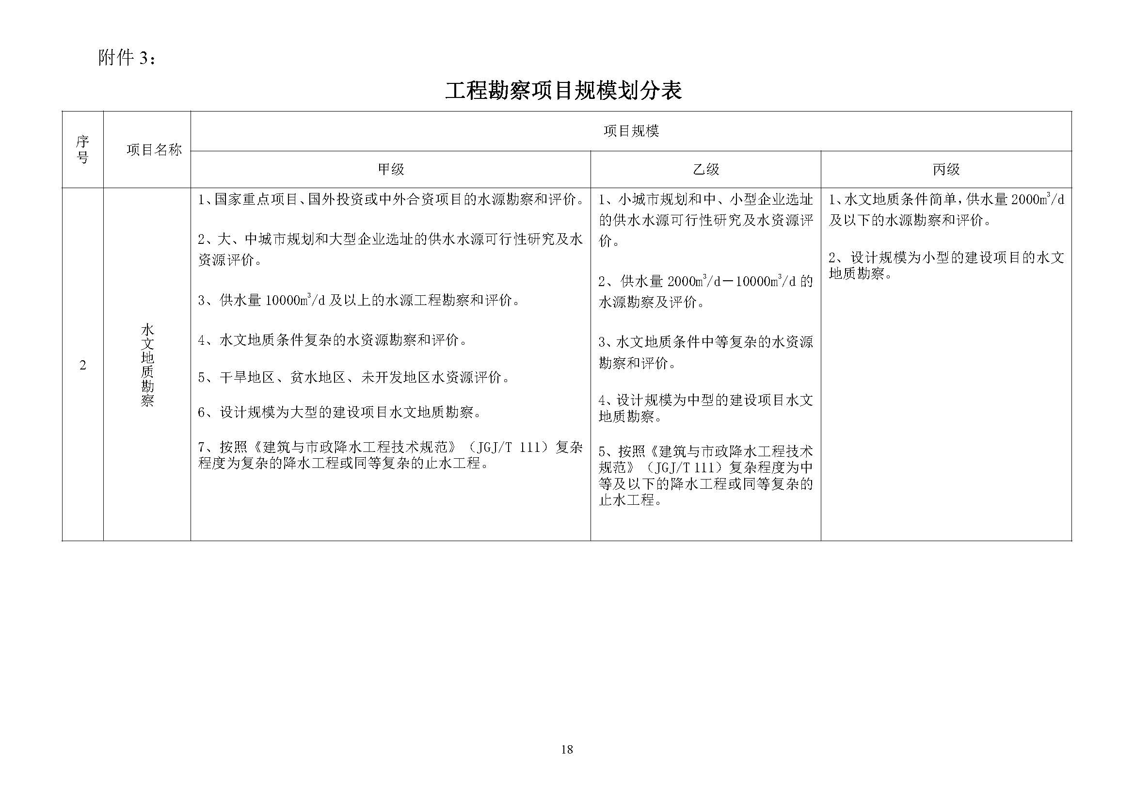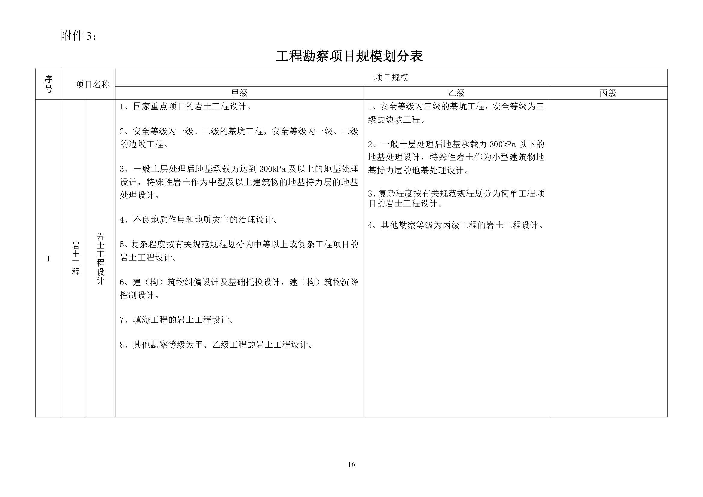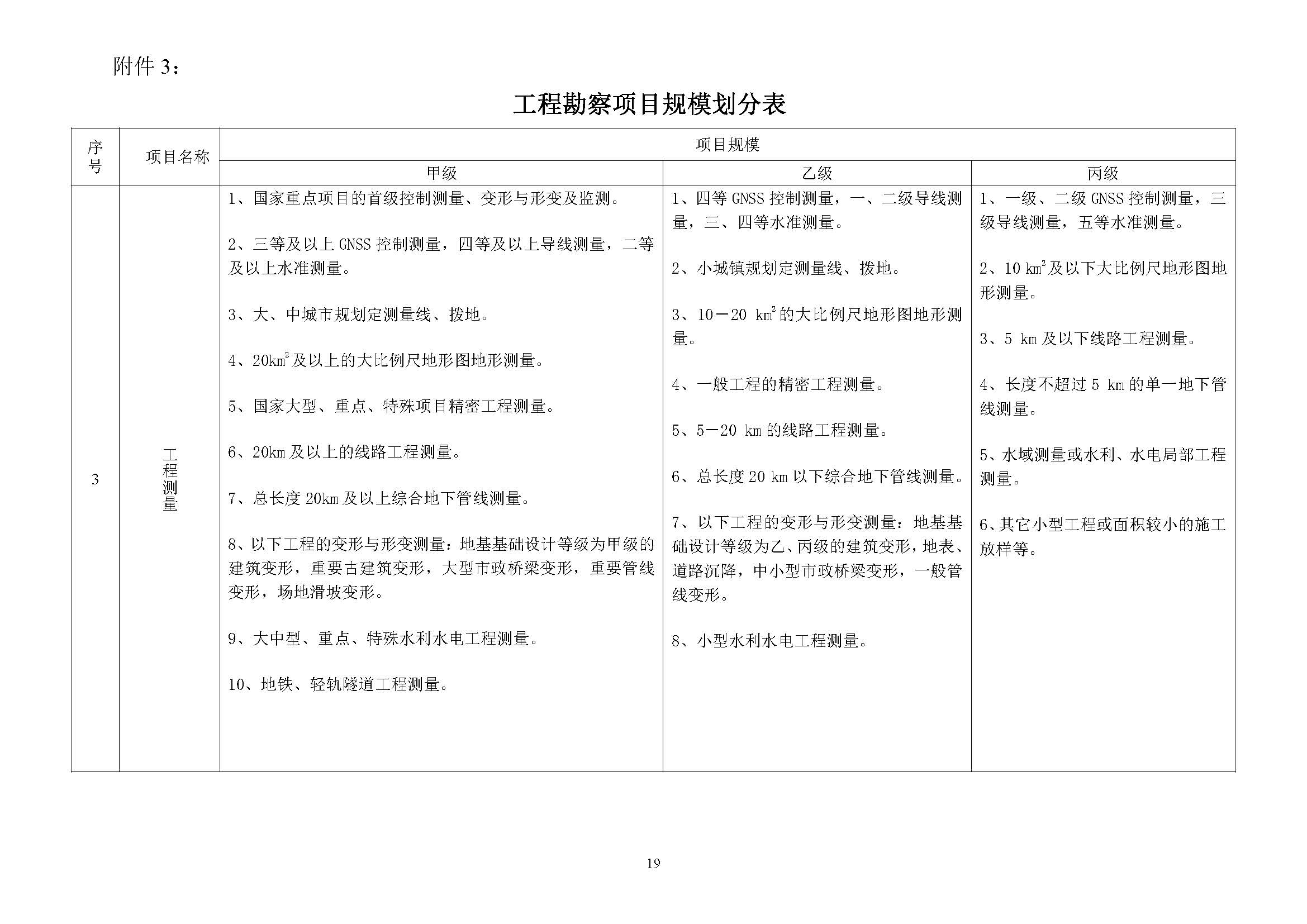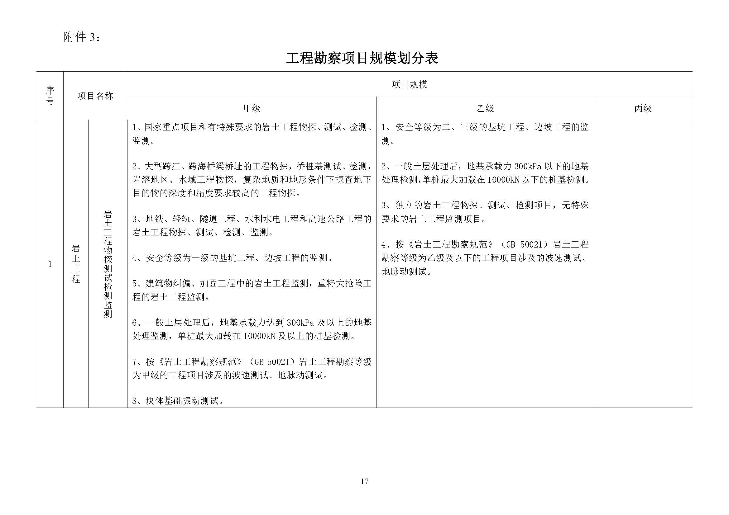 (四)工程勘察綜合資質只設甲級。巖土工程、巖土工程設計、巖土工程物探測試檢測監測專業資質設甲、乙兩個級別;巖土工程勘察、水文地質勘察、工程測量專業資質設甲、乙、丙三個級別。工程勘察勞務資質不分等級。