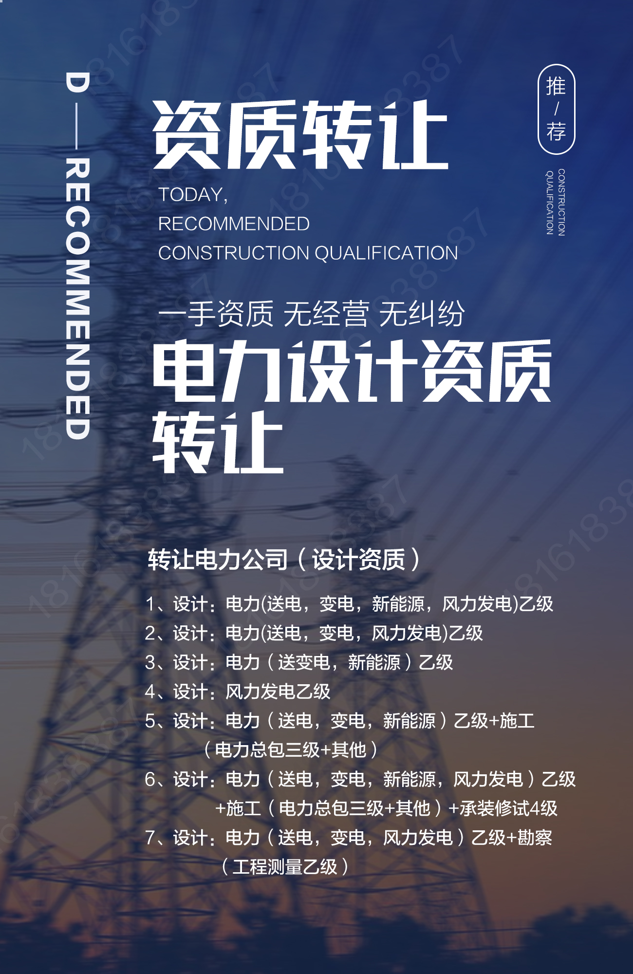 陜西省電力設(shè)計資質(zhì)分為:風(fēng)力發(fā)電設(shè)計、新能源發(fā)電設(shè)計、火力發(fā)電設(shè)計、送電設(shè)計、變電設(shè)計等專業(yè),電力設(shè)計類資質(zhì)辦理周期都比較長,注冊類人員不好找,價格比較貴,這就造成陜西省內(nèi)電力設(shè)計資質(zhì)轉(zhuǎn)讓的都很少,再加上資質(zhì)改革很多地方資質(zhì)新辦業(yè)務(wù)都處在停辦狀態(tài),對于急需要使用電力設(shè)計資質(zhì)的企業(yè)來說,只能去收購一家才有現(xiàn)成資質(zhì)的企業(yè)來承接項目,設(shè)計資質(zhì)轉(zhuǎn)讓是有風(fēng)險的,他的風(fēng)險主要集中在對目標(biāo)公司的實際情況不了解,萬一有債務(wù)糾紛等就會被牽連進(jìn)去,如何找到一家十分干凈的無經(jīng)營的公司是最關(guān)鍵的。下面小編就關(guān)于陜西電力設(shè)計資質(zhì)轉(zhuǎn)讓的相關(guān)問題和風(fēng)險規(guī)避為大家整理了部分資料供大家參考。