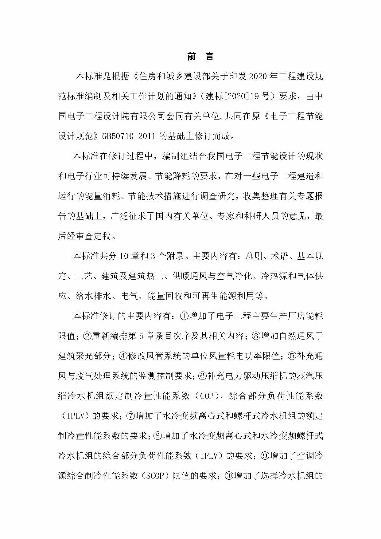 本標準是根據《住房和城鄉建設部關于印發2020年工程建設規范標準編制及相關工作計劃的通知》(建標[2020]19號)要求,由中國電子工程設計院有限公司會同有關單位,共同在原《電子工程節能設計規范》GB50710-2011的基礎上修訂而成。
