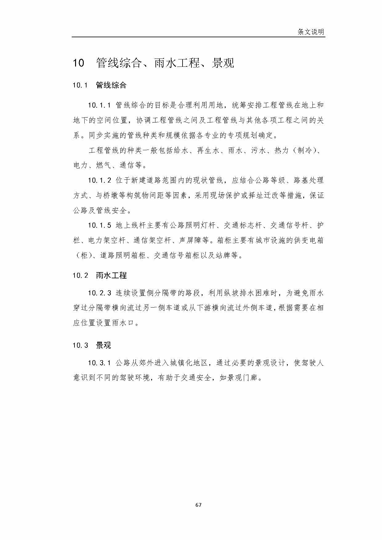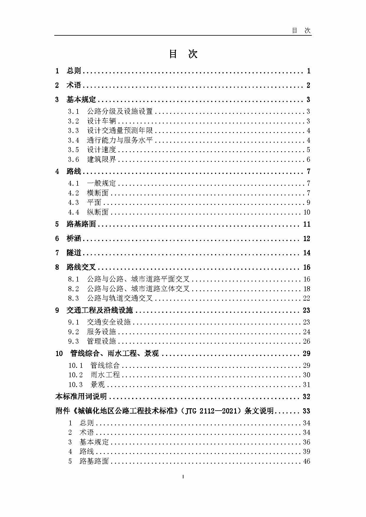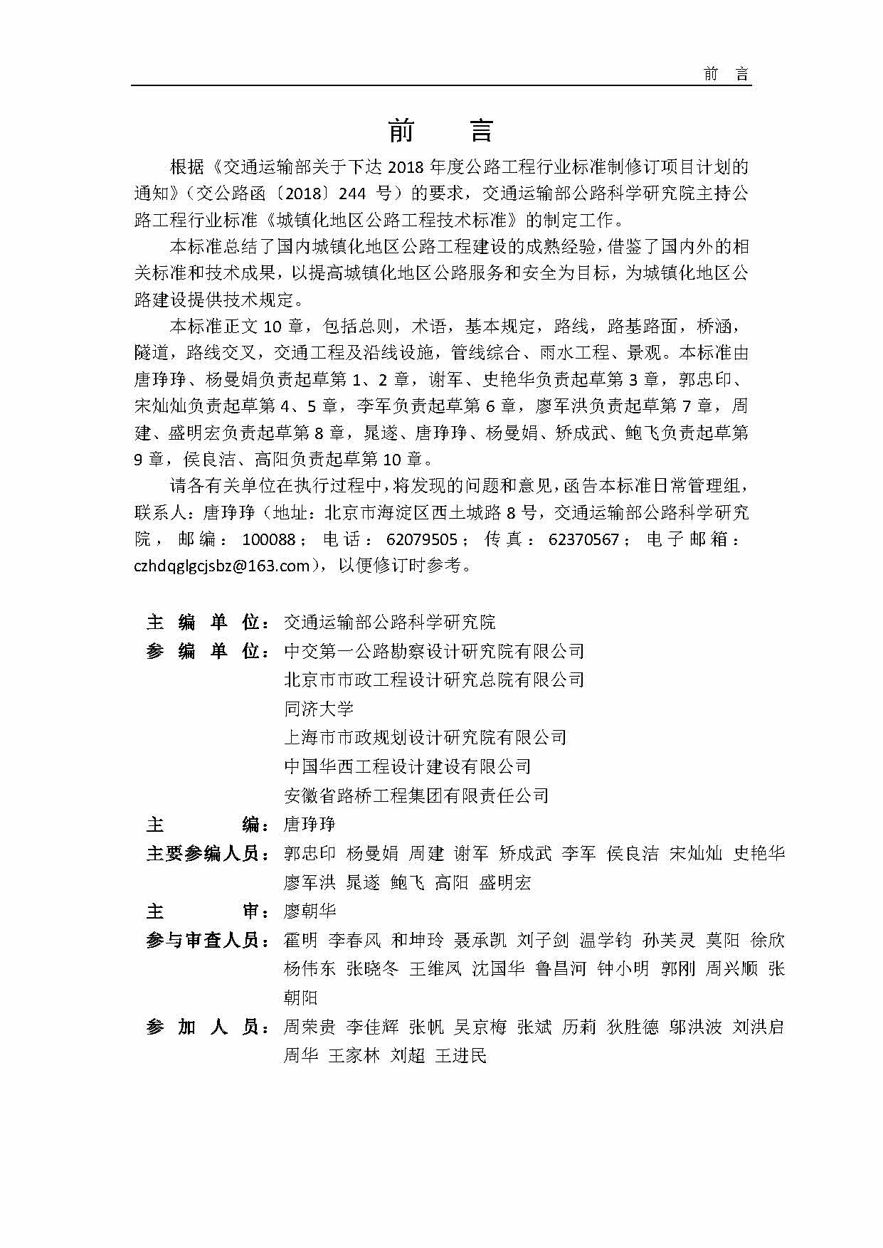 本標準正文 10 章,包括總則,術語,基本規定,路線,路基路面,橋涵,隧道,路線交叉,交通工程及沿線設施,管線綜合、雨水工程、景觀。本標準由唐琤琤、楊曼娟負責起草第 1、2 章,謝軍、史艷華負責起草第 3 章,郭忠印、宋燦燦負責起草第 4、5 章,李軍負責起草第 6 章,廖軍洪負責起草第 7 章,周建、盛明宏負責起草第 8 章,晁遂、唐琤琤、楊曼娟、矯成武、鮑飛負責起草第9 章,侯良潔、高陽負責起草第 10 章。