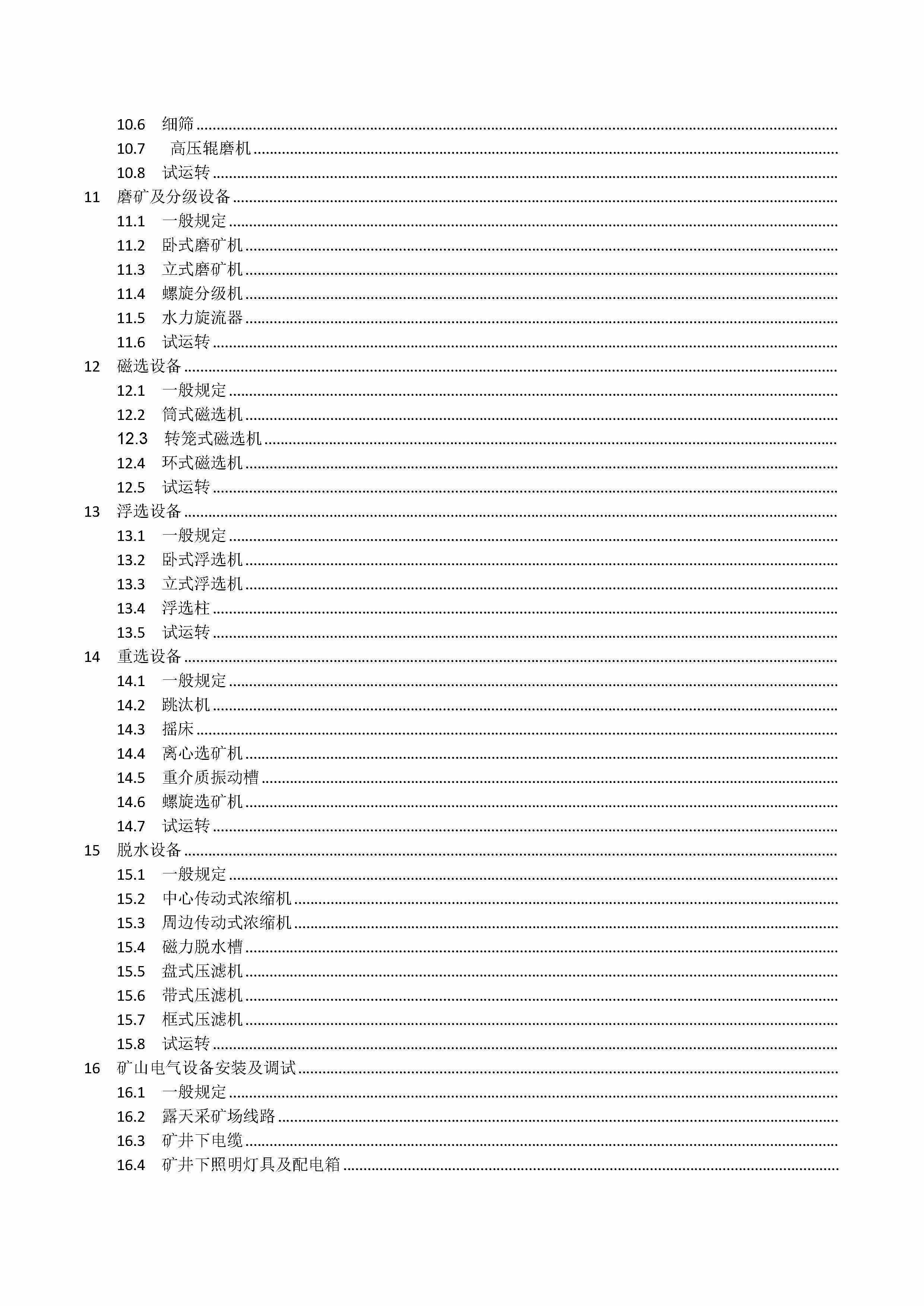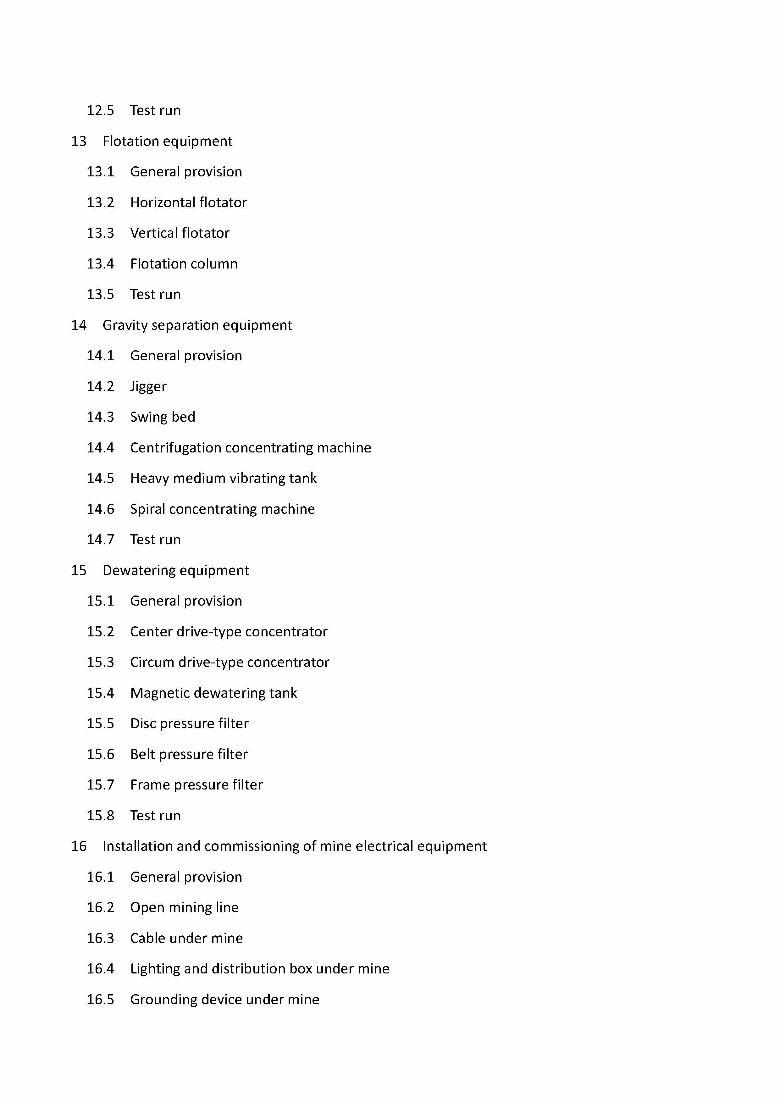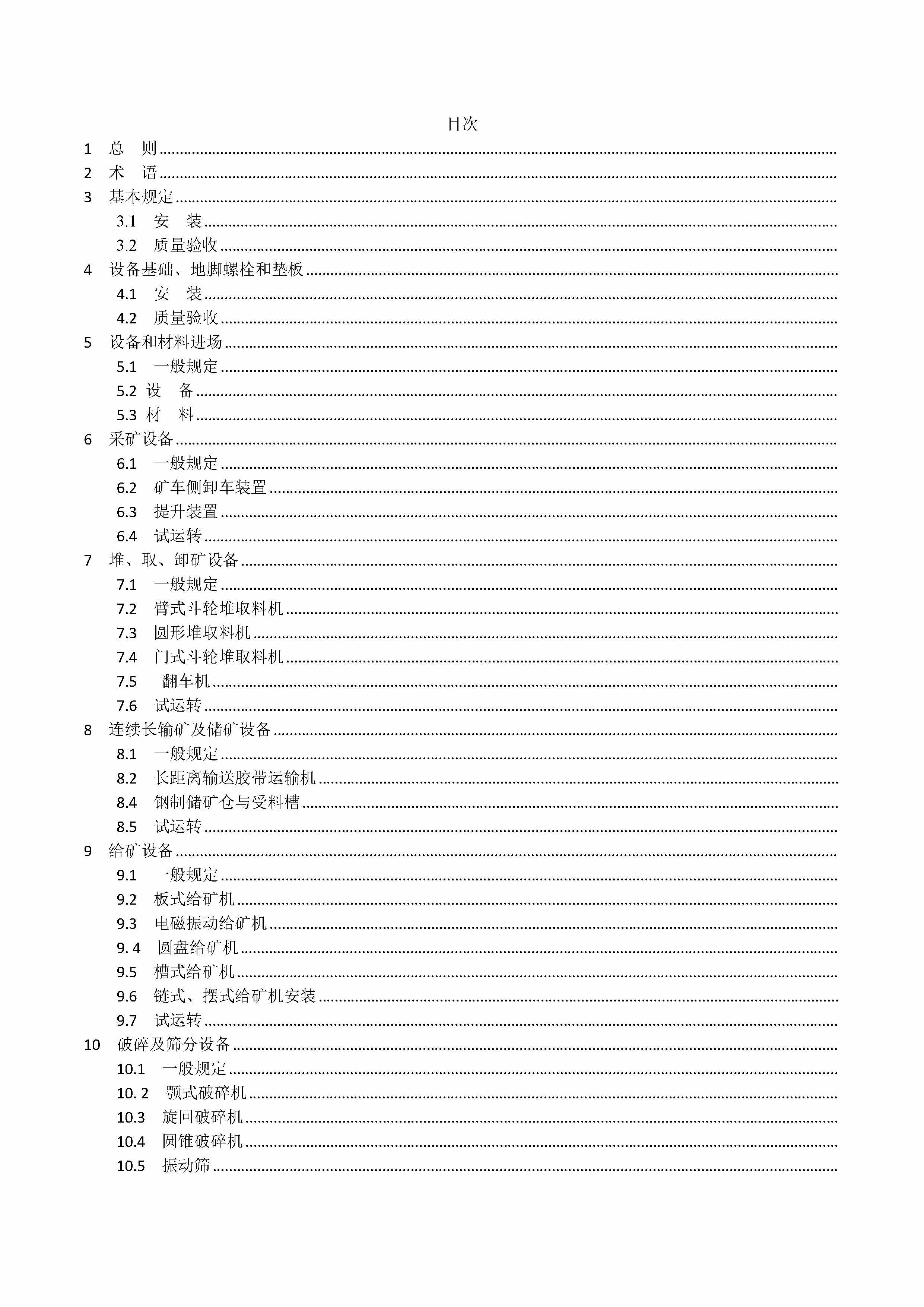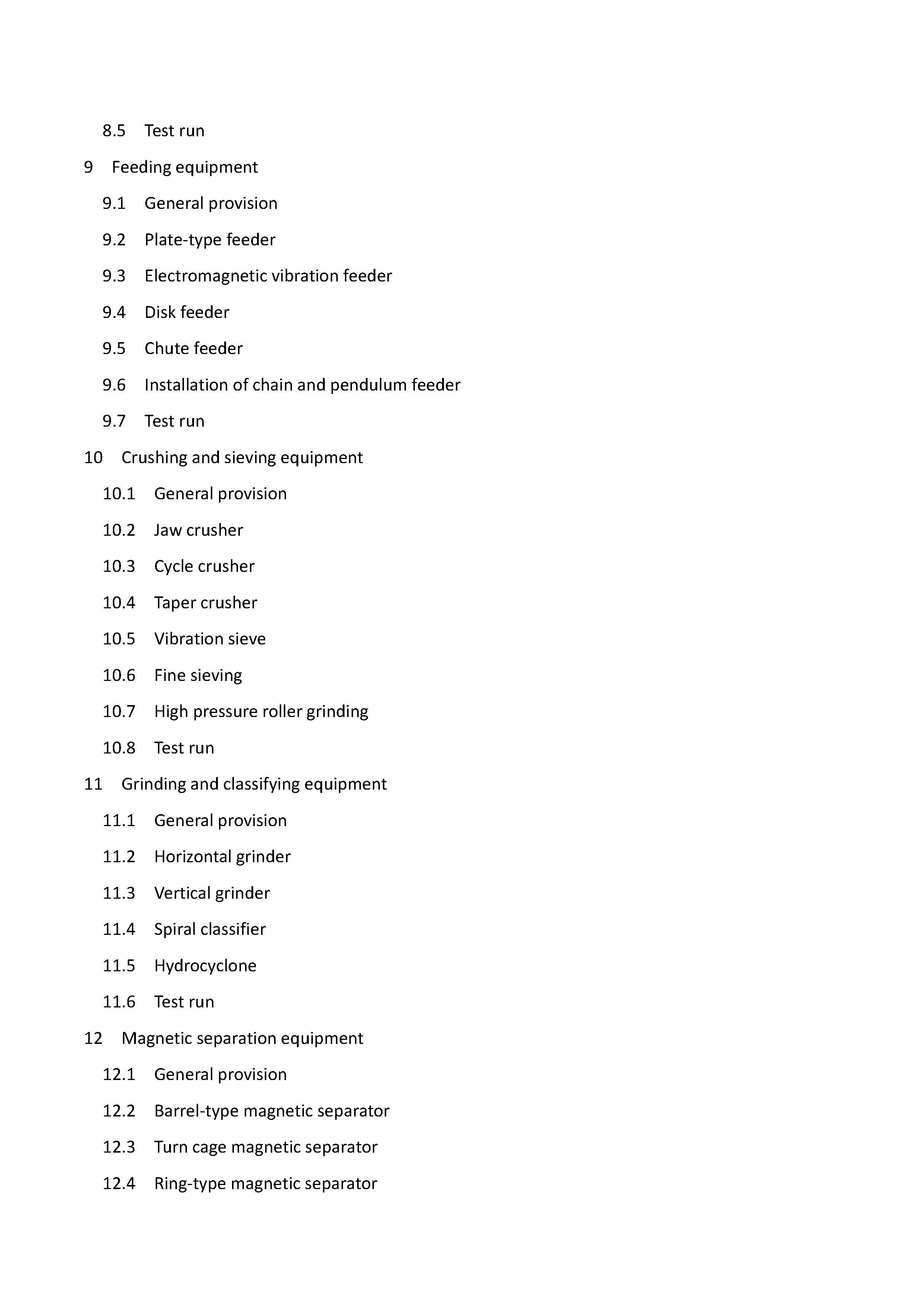 本規范共分17章,包括總則,術語,基本規定,設備基礎、地腳螺栓和墊板,設備和材料,堆、取、卸礦設備,連續長輸礦設備,儲礦倉及受料槽(斗),給礦設備,破碎及篩分設備,磨礦設備,分級設備,磁選設備,浮選設備,重選設備,脫水設備,安全環保。本規范中以黑體字標志的條文為*性條文,必須嚴格執行。